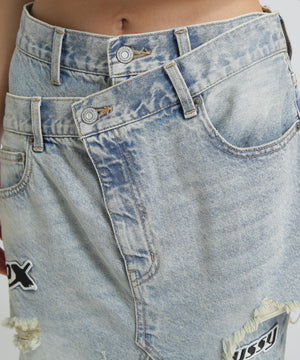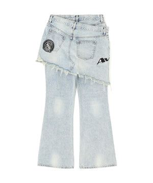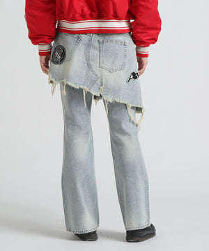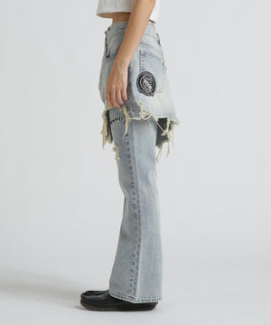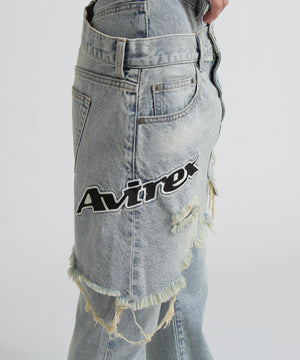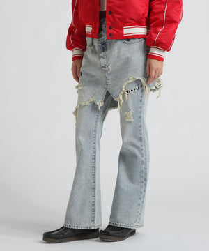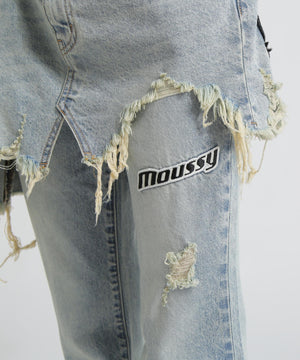 カットオフしたデニムスカートをフェイクレイヤーしたデニムパンツです。AVIREXのロゴとmoussyロゴ、ワッペンをプラスしたコラボ商品。