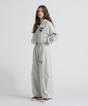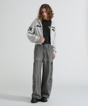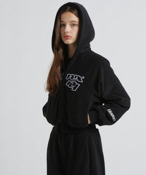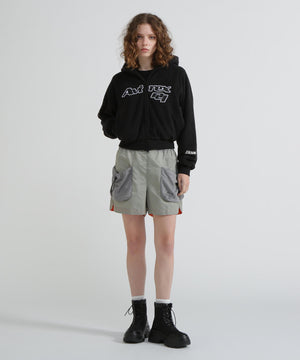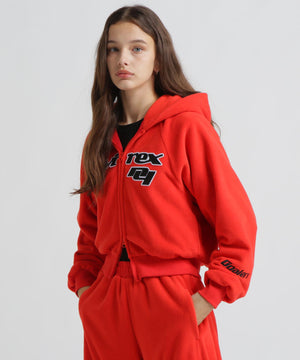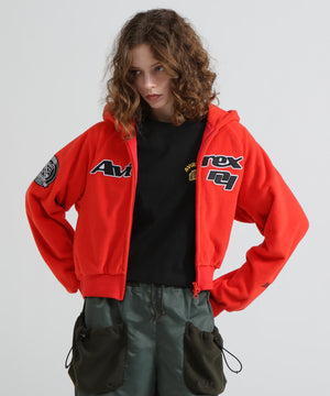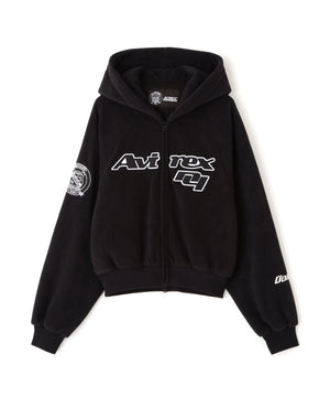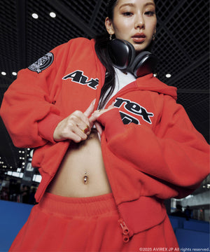 AVIREXとのコラボフリースフーディー。胸元のAVIREXロゴが大胆なデザインで、ショート丈なので女性らしく着用できるアイテム。