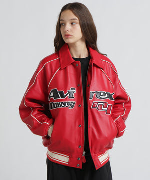 AVIREX定番のレザーバーシティージャケット。胸のAVIREXロゴの下にmoussyロゴを組み合わせたコラボアイテム。