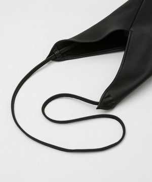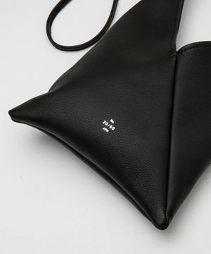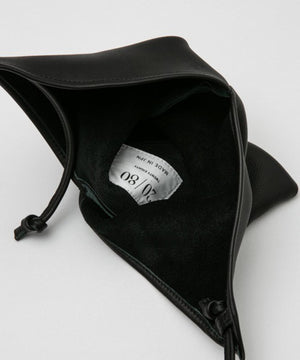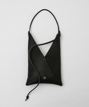 シュリンクレザーを使用し、あずま袋をアレンジしたミニショルダーバッグ。日本古来の包む文化から、風呂敷を縫い合わせて鞄代わりにしたのがあずま袋の始まりと言われ、折り紙のようにたたみながら作っていく理に適った構造となっています。本来の先端を結んで短く持つ仕様ではなく、別途ショルダーストラップを付属、先端を結んで留める仕様により、長さ調節が可能となっています。短くして巾着のような雰囲気で持つこともできます。*シュリンク加工を施しているレザーのため、シボの雰囲気には個体差がございます。