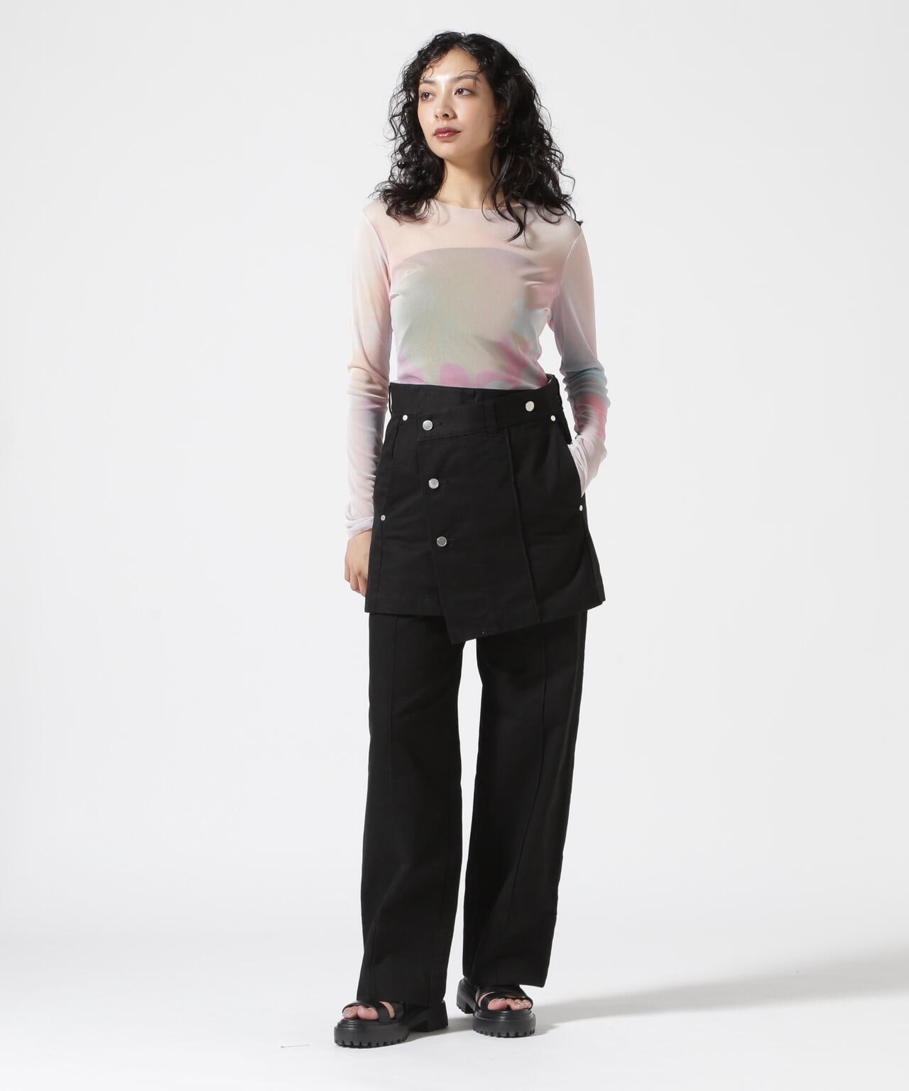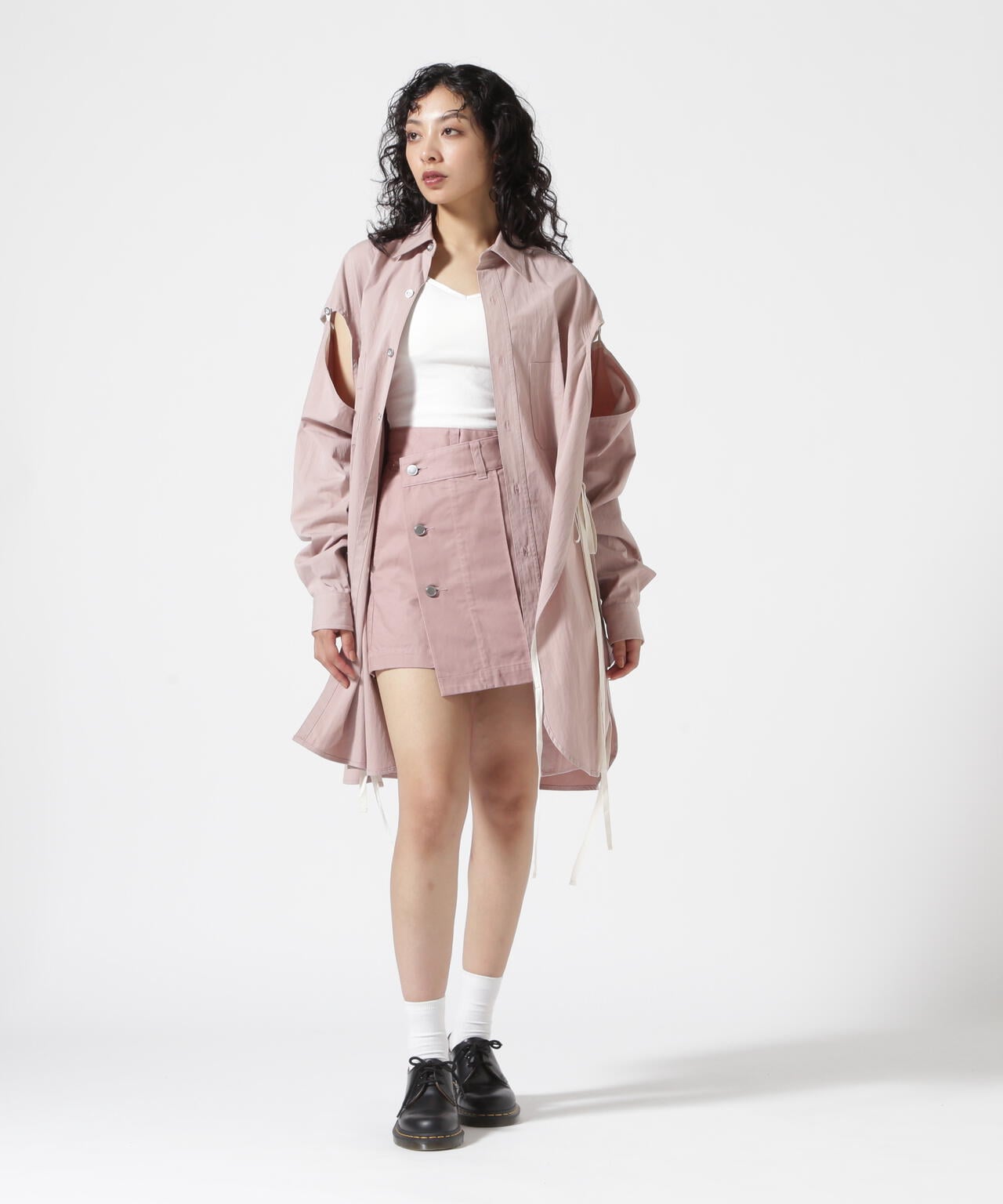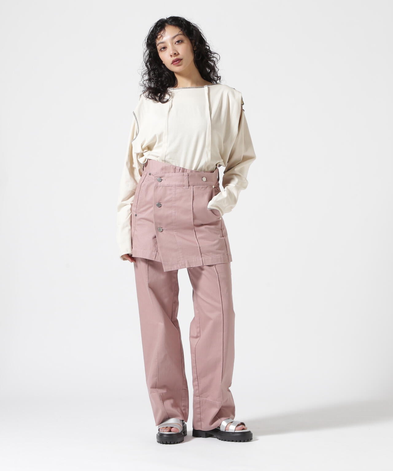ジャケットやクロップド丈のシャツやカットソー、ニットやスウェット類と合わせることでバランスのよいスタイリングが完成します。