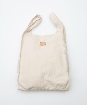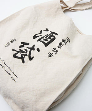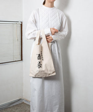 酒袋と呼ばれる倉敷キャンバスを使用したグローサリーバッグ。酒袋は酒布とも呼ばれ、江戸時代から戦前くらいまで日本酒のもろみを絞るのに使われていました。もろみをこの布で包んで吊るしておき、そこから落ちた清酒を採取していたことが名前の由来になっています。その日本古来の生地に、ストレートなテキストを縦書きでプリントしています。反対面にはポイントとしてヌメ革のレザーパッチを配し、口元には杉綾テープで結ぶことができる仕様になっています。ワンウォッシュすることでうねりや凹凸感が強調され、この生地特有の表情を強く出しています。