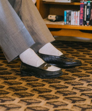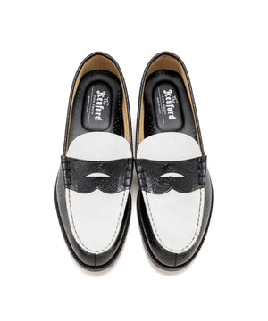 ペイズリー柄を全面に型押しした国産カウレザーのローファーを、定番のブラックホワイトの配色で仕上げた1足。