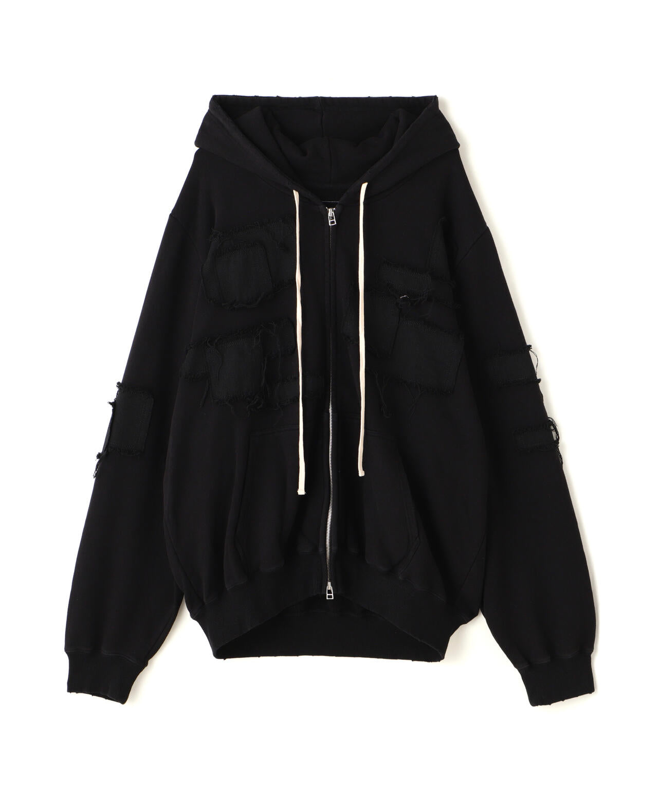 前後の身頃と肘部分にパッチワークデザインをほどこしたフルZIPフーディー。
