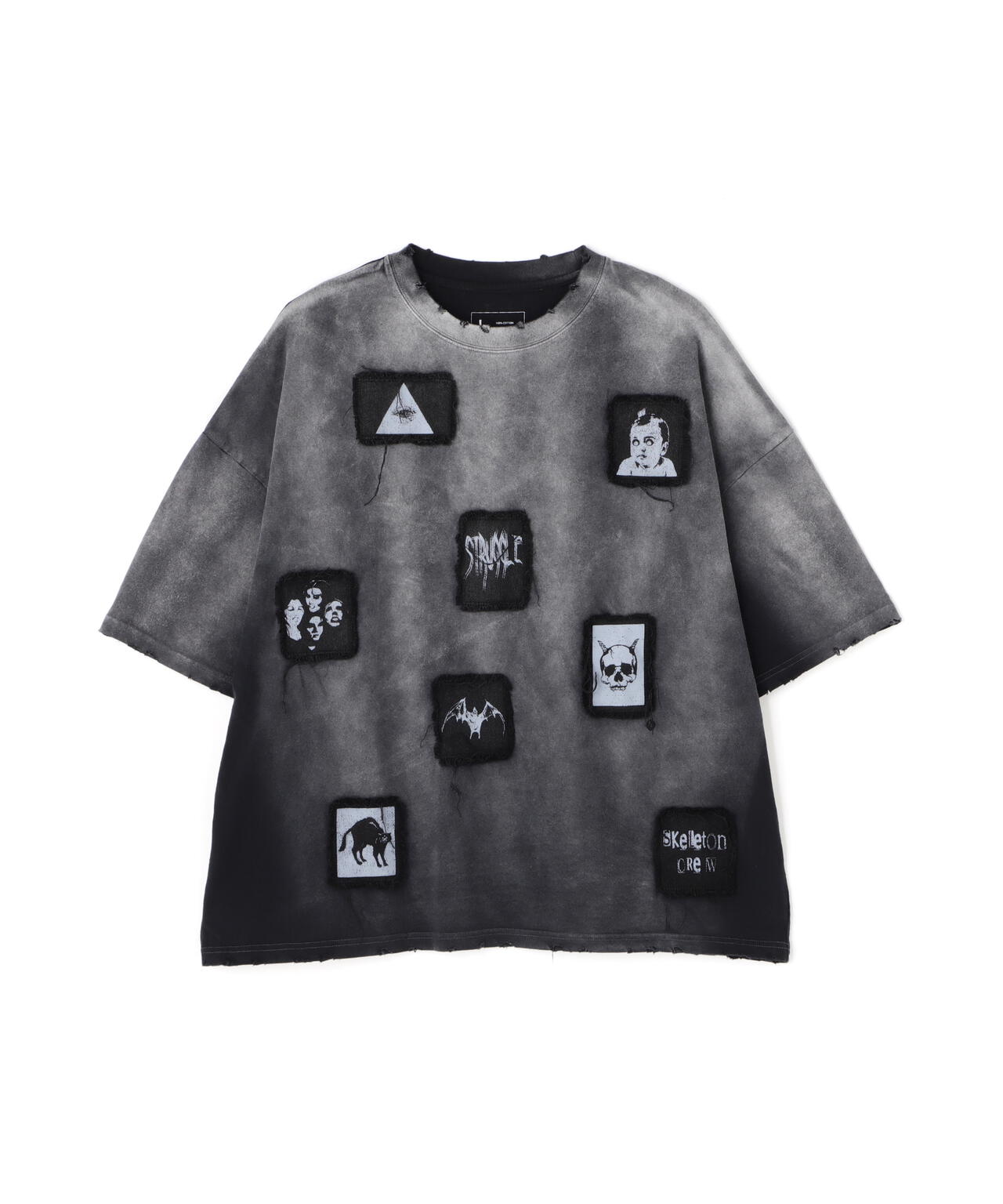 フロントにグラフィックプリント入りのパッチを飾ったユニークなデザインのTシャツ。