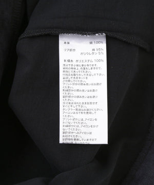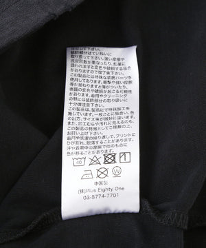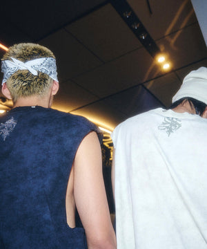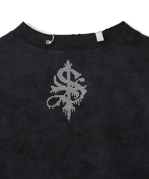 フロントにはブランドロゴ刺繍とピアス、バックは首元にラインストーンで表現したクロスロゴを飾った一着。