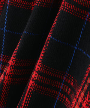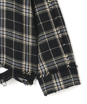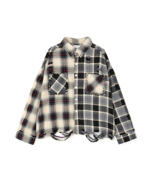 複数のヴィンテージチェックパターンをドッキングし、左右非対称な大胆な切り替えデザインで仕上げた唯一無二の一着です。