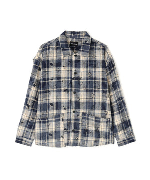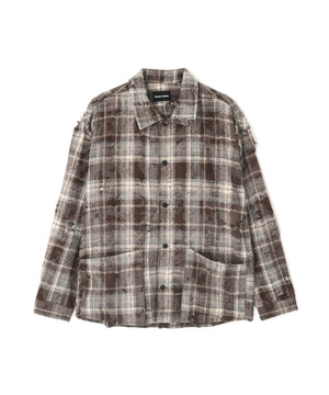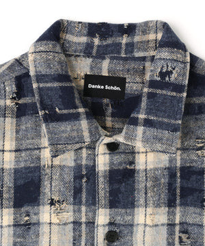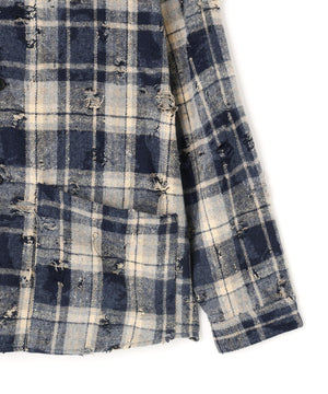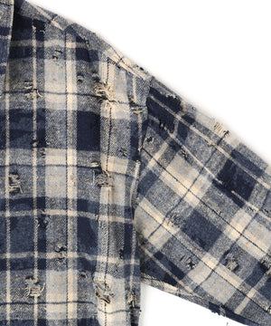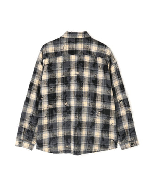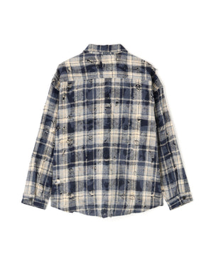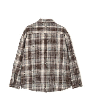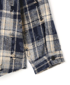 ボディ全体にダメージ加工が施されたチェックシャツ。