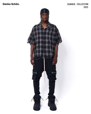 袖と裾にほどこしたダメージ加工がアクセントになっている半袖チェックシャツ。