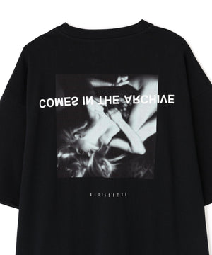 背面には「COMES IN THE ARCHIVE」の印象的なタイポグラフィと、美しくもミステリアスな女性のフォトプリントが大胆に配置され、唯一無二の存在感を放ちます。
