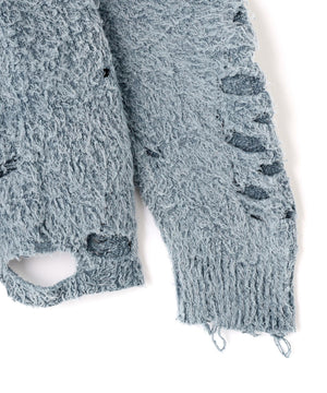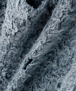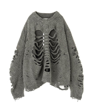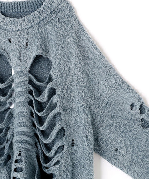 まるで肌の下から肋骨が浮かび上がるような不気味なこのニットは、綿100%の優しい着心地に加えて、製品加工が生み出す長年着古したヴィンテージの洋服のような独特の風合いが特徴です。