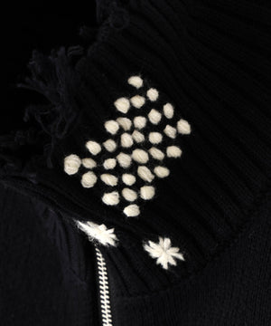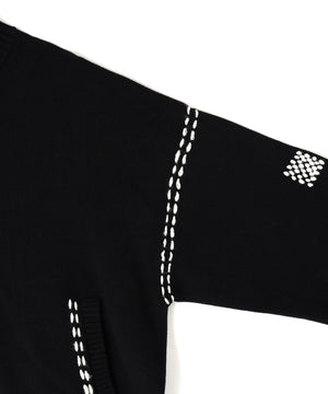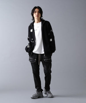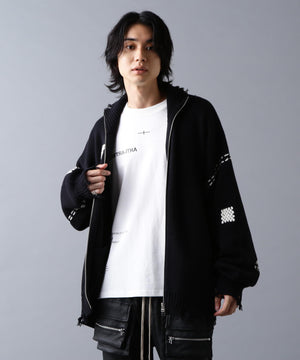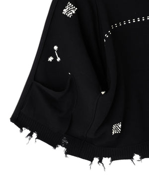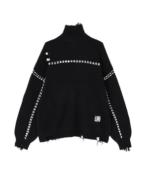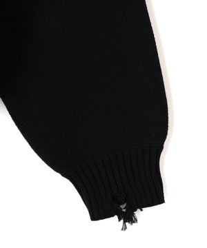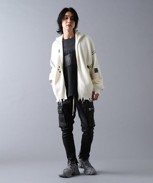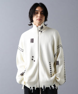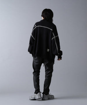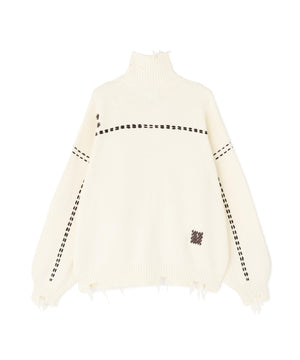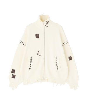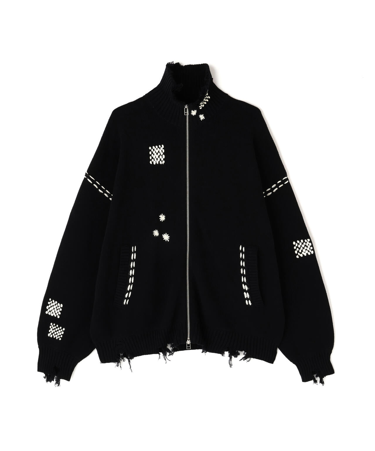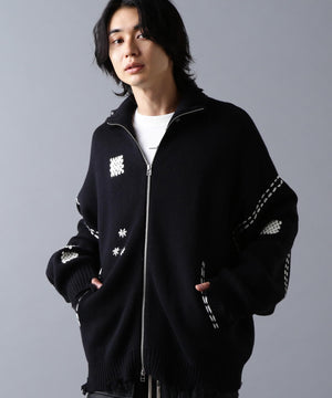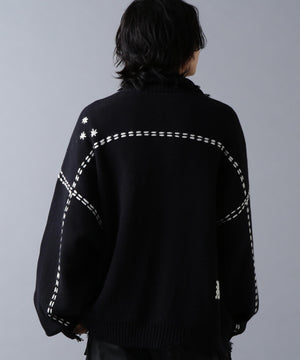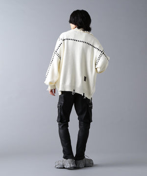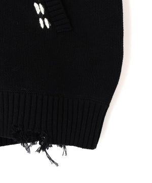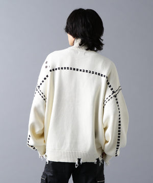 ハンドステッチ風の刺繍とボディの随所にあしらったダメージ加工やカットオフデザインが目を惹くドライバーズニット。