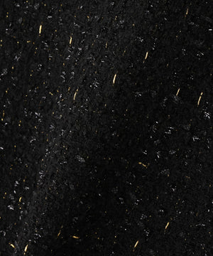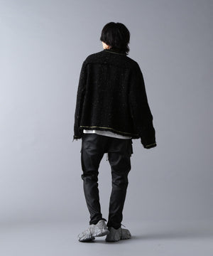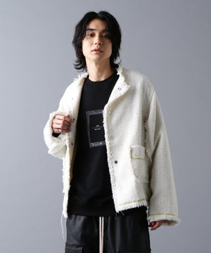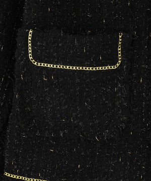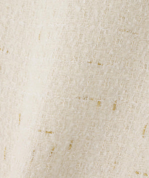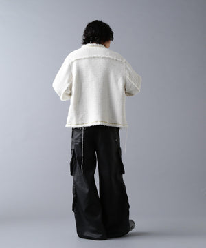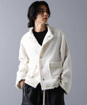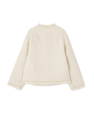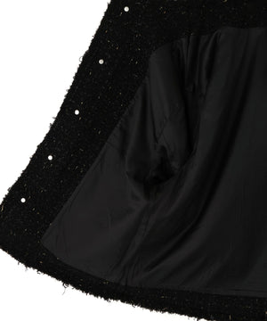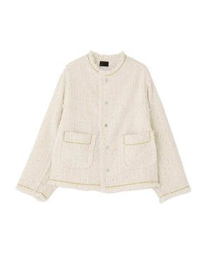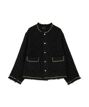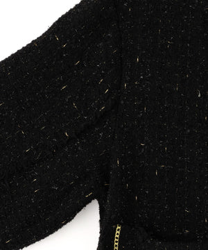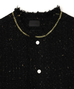 ラグジュアリーな風合いのツイード素材をベースに、全体をカットオフ仕様で仕上げ、裾やポケットの淵にゴールドのチェーンを飾ったノーカラージャケット。