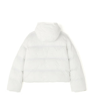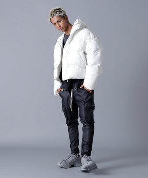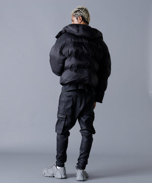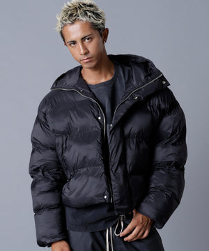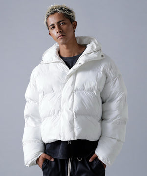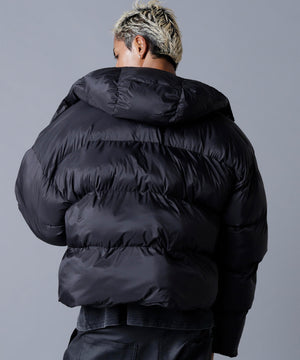 モダンな光沢と洗練されたボリューム感が魅力の「高密度NYLON HOODED BLOUSON」。