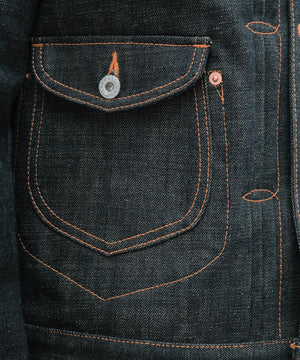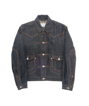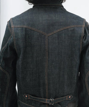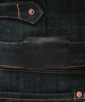 507XXをベースに再構築したデニムジャケットは、トリプルプリーツやオーバルステッチ、象徴的なワイングラス型のポケットを内外両面に配しています。袖口から伸びるエルボーパッチに加え、テーラードスリーブがインパクトのあるシルエットを演出します。素材はSUGARHILL ORIGINAL DENIM 14oz。ムラのある風合いが特徴的な丈夫なコットンを主体とした生地です。経糸はインディゴロープ染め、緯糸は従来のナチュラルカラーではなくカーキ色に染めています。カーキ色の緯糸を使用することでヴィンテージのような深みのある色落ちを実現しています。