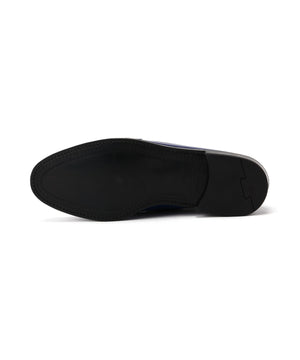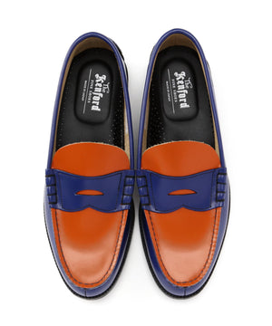 国産カウレザーのローファーを、ブルー×オレンジの配色で仕上げた1足。