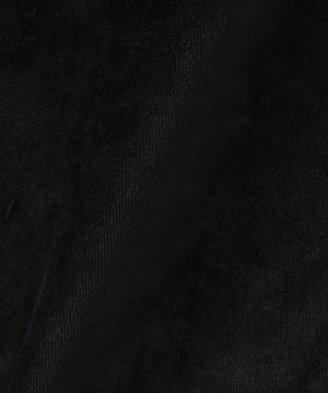 光沢のあるブラックベロアが暗色コーデに奥行きを生み出し無地アイテムと合わせても立体的なスタイリングに。