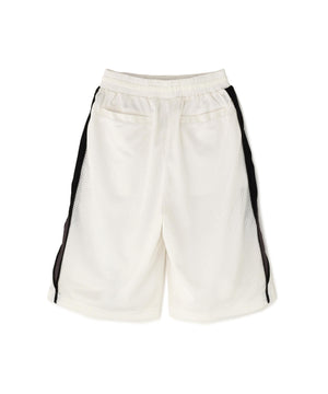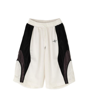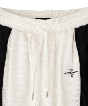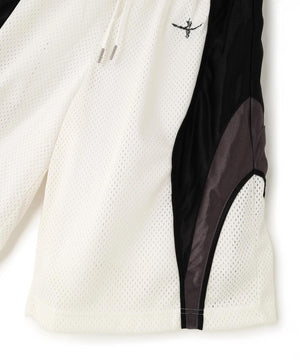異素材の切り替えやブランドのシンボルである4マークロゴ刺繍が目を惹くメッシュショーツ。