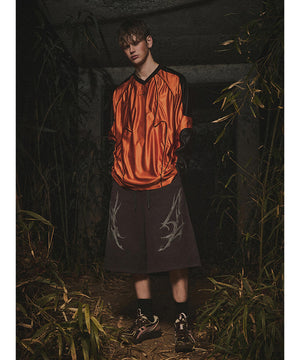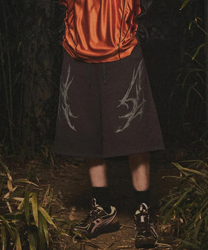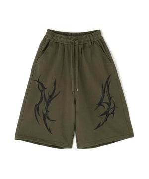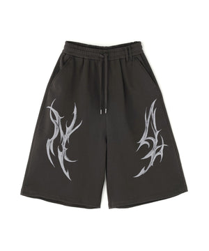 立体的なトライバルデザインをフロントに飾ったスウェットショーツ。