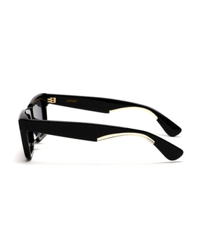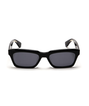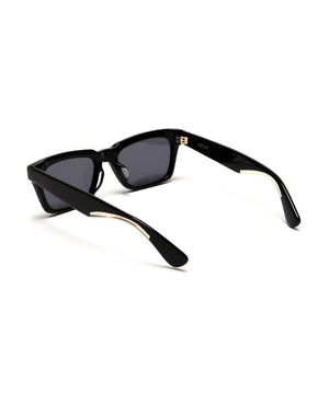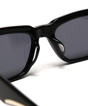 重厚で無骨な印象を与えるリムの厚みがメンズライクな雰囲気を醸し出し、平なフロント上部ラインにカットを足すことで立体的に。