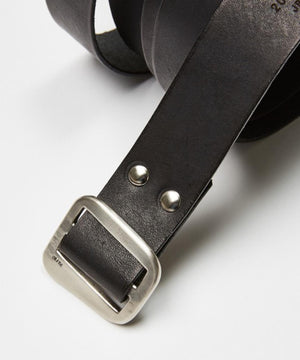 オリジナルの真鍮製バックルを使用した28mm幅のレ ザーベルト。レザーは2mm厚の薄い仕上げにするこ とで、ライトウェイトで付け心地も良いベルトに なっています。バックルに通すだけのイージーな仕 様で、トップスから少し出るぐらいの長さになって います。 *ベルトの長さは、付け根~先端で 117cmです。