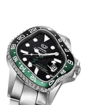 ペゼル(額縁)はブラックをベースにそれぞれネイビー・グリーンのカラーをあしらい、ユニークなデザインの針を使用した前衛的なモデル。
