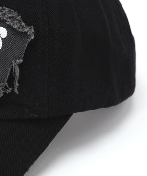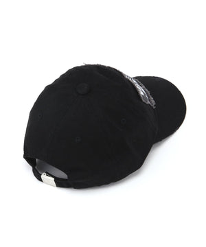 素材の荒々しさとパッチの存在感が、スタイリングに重厚なアクセントを添えるキャップ。