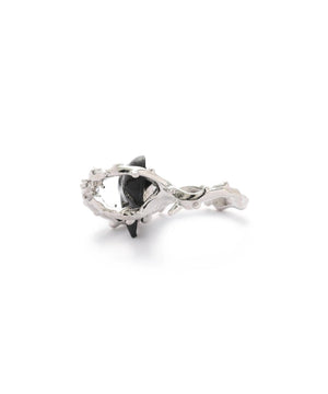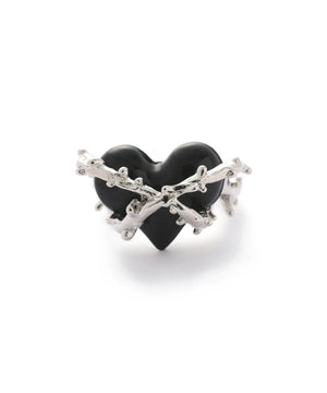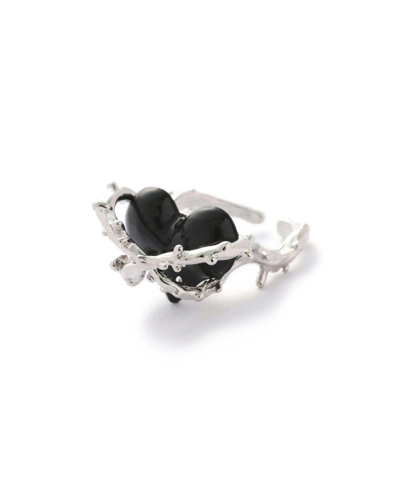 ボリュームあるハートの立体感と、絡みつくようなメタルモチーフの組み合わせが印象的なリング。