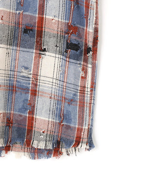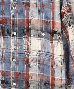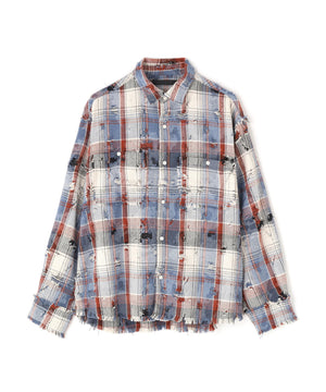 チェック柄にカモフラージュ要素をミックスし随所にダメージ加工を施した存在感抜群のロングスリーブシャツ。