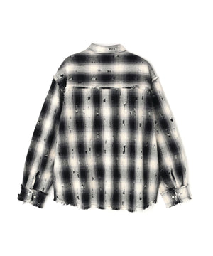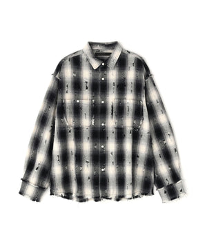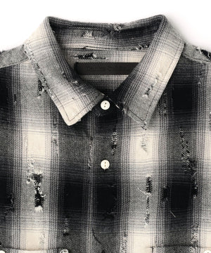 オンブレチェックをベースに、随所へ大胆なダメージ加工を施したロングスリーブシャツ。