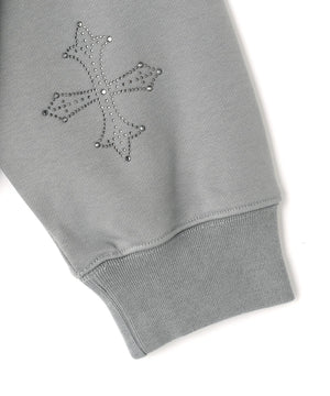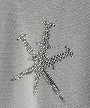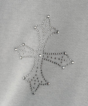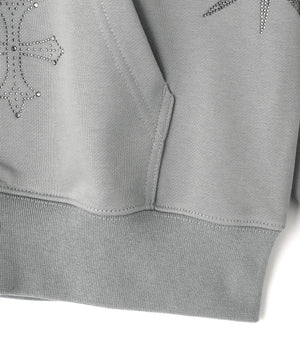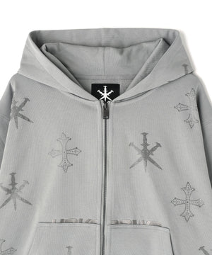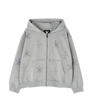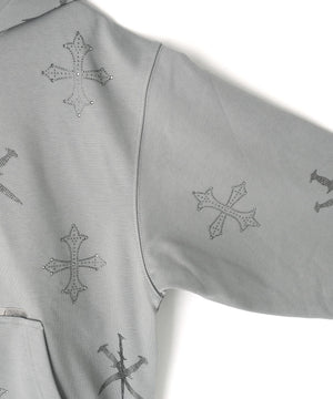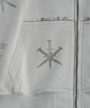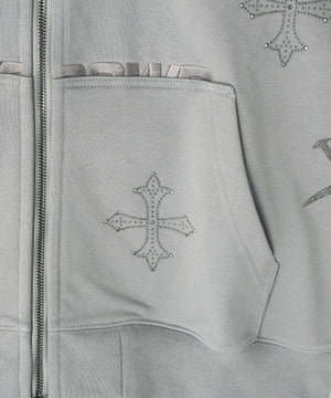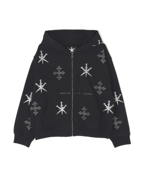 存在感のあるダガークロスモチーフを全体に散りばめたラインストーンで表現したジップフーディー。