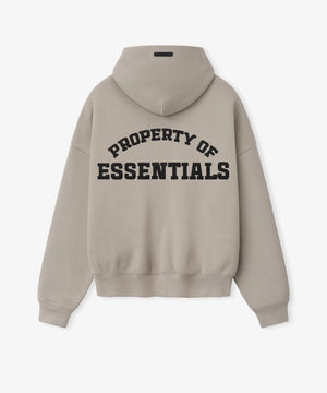 ハーフジップフロント、二重構造のフーディー、サイドポケット、リブニットの袖口と裾、フードの縁にはエッセンシャルズのシグネチャーラベルがあしらわれています。