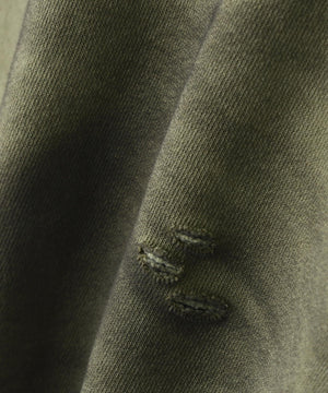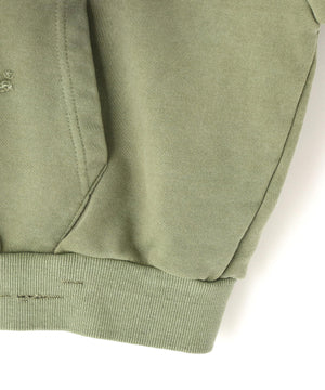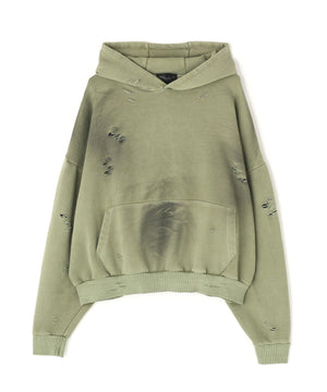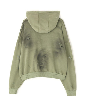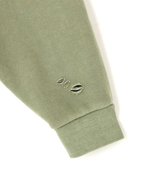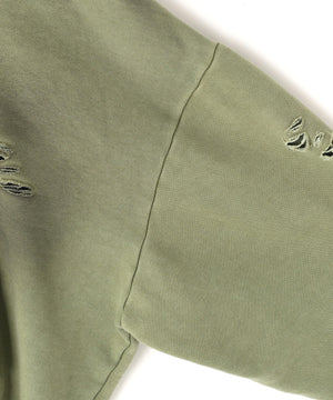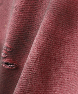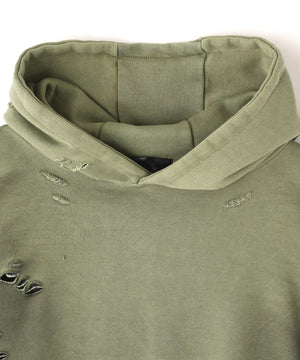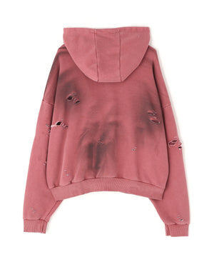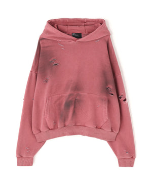 ダメージ加工とスモーキーなフェード感が絶妙に融合した、SISらしい遊び心とストリートムードが漂うプルオーバーフーディ。