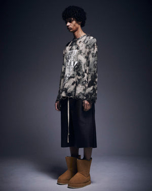 フロントには存在感のあるロゴプリントを配置しニット特有の柔らかさとエッジの効いた加工感を融合。