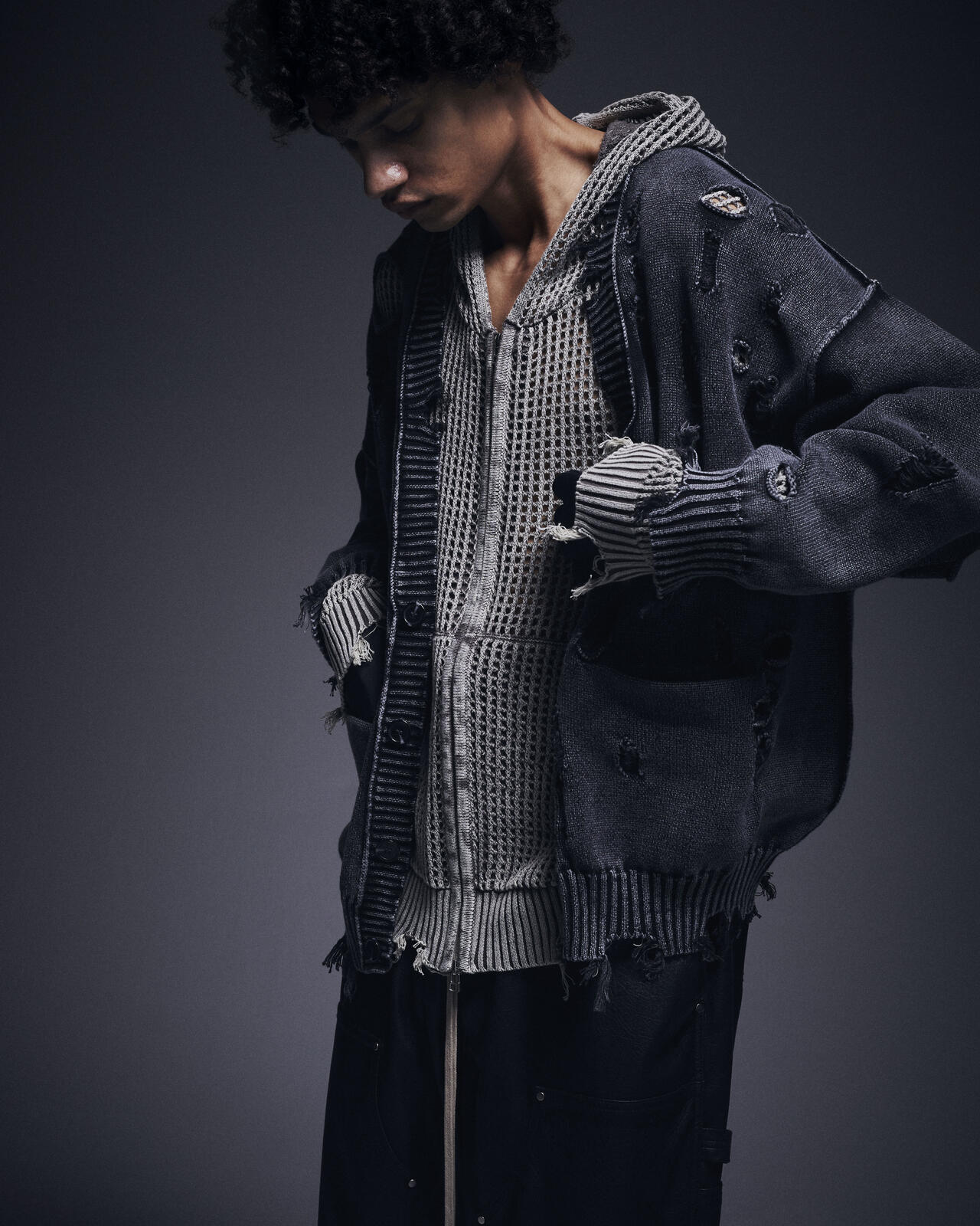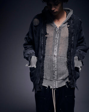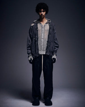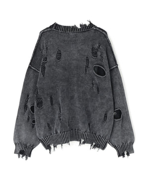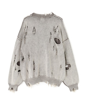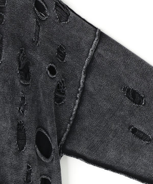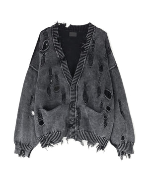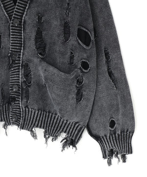 ダメージ加工とアシッドウォッシュを掛け合わせた、グランジ感あふれる天竺素材のカーディガン。