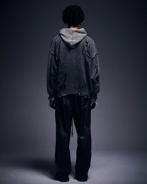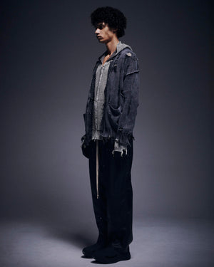 全体に施されたランダムなクラッシュホールと色落ち表現がヴィンテージライクで存在感のある一着に仕上がっています。