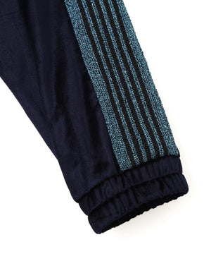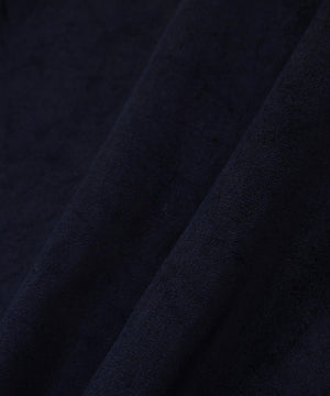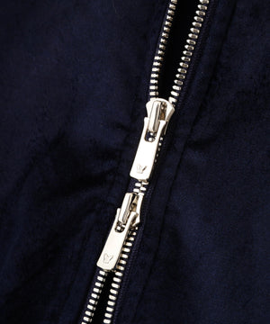 そして今回の別注の肝となるのが、ボディに採用したベロア素材。定番のトラックセットアップとは異なるしっとりとした落ち感とコシのある光沢が、羽織るだけでスタイリングの表情を一段引き上げてくれます。