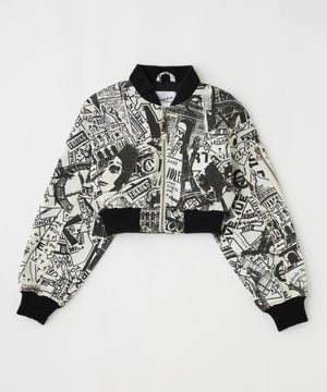 VAQUERA × MOUSSYの「PARIS SYNDROME」シリーズから登場した、総柄デザインが圧倒的インパクトを放つクロップドボンバージャケット。パリの風景や文字をコラージュしたグラフィックを全面にプリントし、アート性とストリートの強さを融合させた一着です。ボンバージャケットのボリューム感を活かしながら、大胆にカットしたクロップド丈でバランスを再構築。ネック、袖口、裾にはリブを配し、シルエットを引き締めつつ着用しやすい仕上がりに。フロントにはダブルジップを採用し、開け方によってスタイリングのニュアンスを変えられます。ハイウエストボトムやワンピースとの相性が良く、コンパクトながら造形的なシルエットがスタイル全体をモードに引き上げるアイテム。同シリーズのデニムやピナフォアとの連動スタイリングもおすすめです。