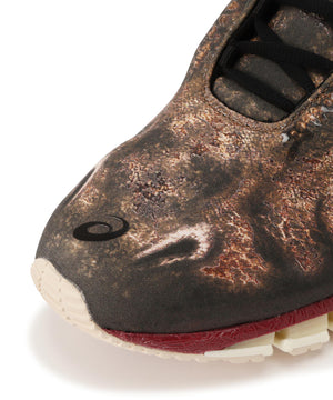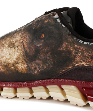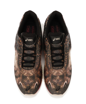 今回のコラボレーションのテーマは「ジュラ紀の世界観」です。アッパー全体には恐竜の頭部を描いた大胆なグラフィックプリントを配置。3Dプリント加工によって恐竜の肌のような凹凸感を表現し、さらにウレタン素材の立体的な配置で、まるで恐竜頭部の輪郭が浮かび上がるような設計が特長です。これはアシックスが追求してきた精緻な成形技術と機能美によって生まれたディテールとなっており、遊び心のあるデザインの奥に確かなスポーツテクノロジーが反映されています。