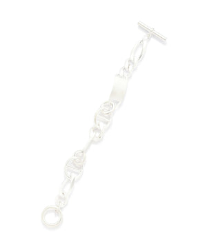 数種類のチェーンを組み合わせたシルバー925のブレスレット。アンカーパーツやIDプレートをメインに、ボリュームのあるチェーンは存在感があり、角度により見え方が変わるブレスレットとなっています。留め具パーツのTバーと丸カンは、大きめのサイズで存在感を出しています。丸カンには刻印入り。仕上げの鏡面加工により光沢を強く出しています。