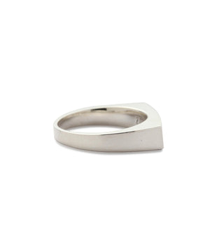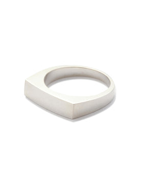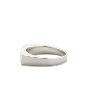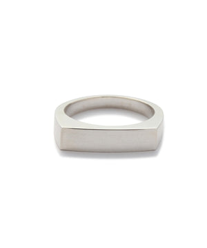 シルバー925のスクエア型シグネットリング。シャープでエッジの効いたシルエット。シグネットリングは本来自分のイニシャルを入れるリングですが、イニシャルを入れる前の無地の状態をデザインとして落とし込んでいます。仕上げは鏡面加工で光沢を強く出しています。裏面に刻印入り。