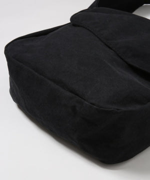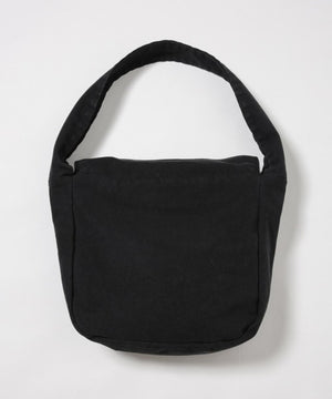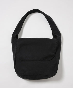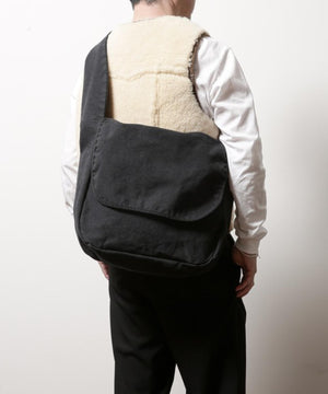 製品染めを施した8号キャンバスのメッセンジャーバッグ。反応染めにて奥行きのある色味に染め上げ、後加工でムラ感やアタリ感を出しています。フラップ、ボディ、ストラップは生地を2枚合わせにすることで独特の膨らみ感を出しています。ボディとストラップはステッチが表に出ないミニマルなデザイン。ストラップは幅を広くして存在感を出しています。背面側に内ポケットが1つ付属します。