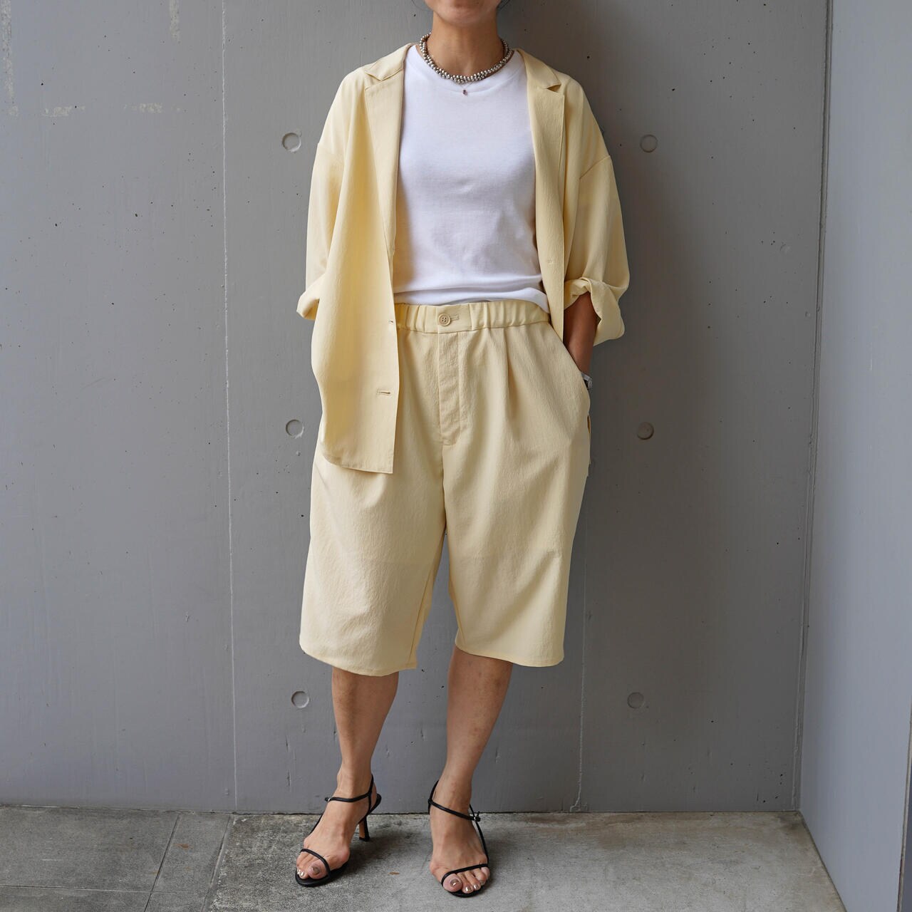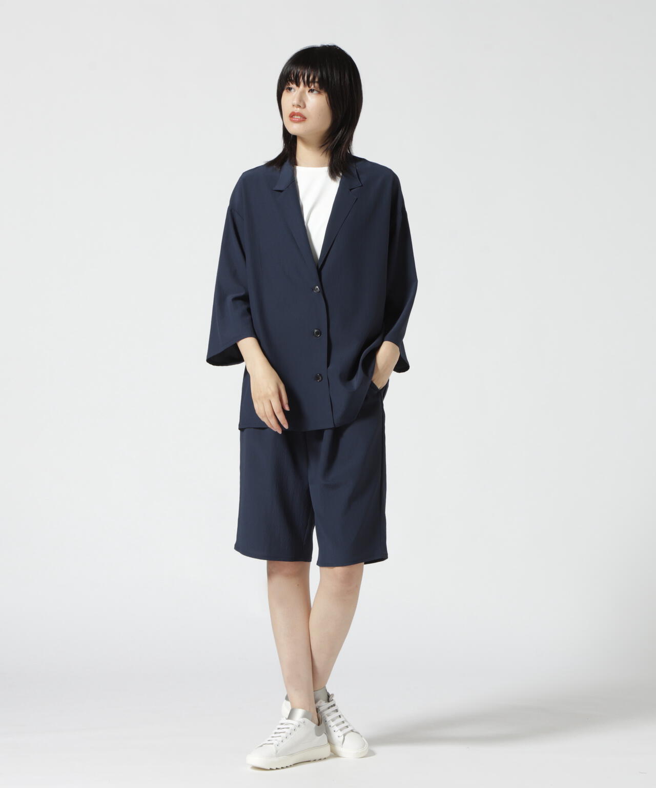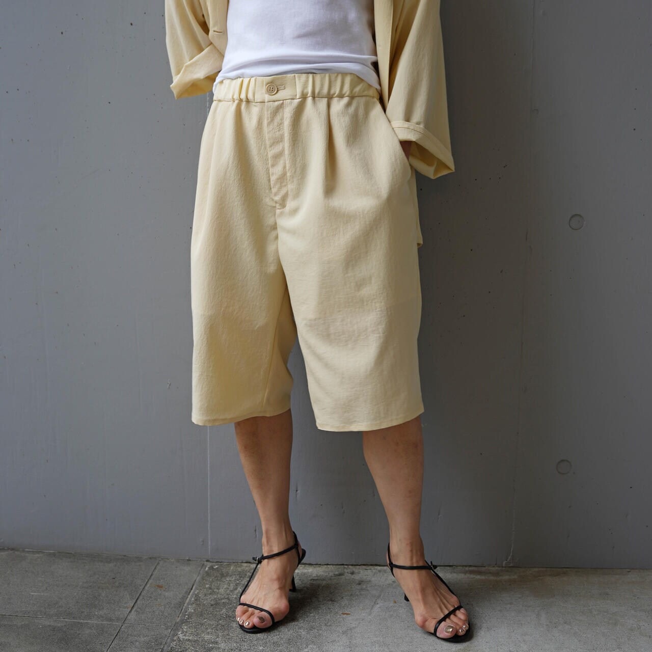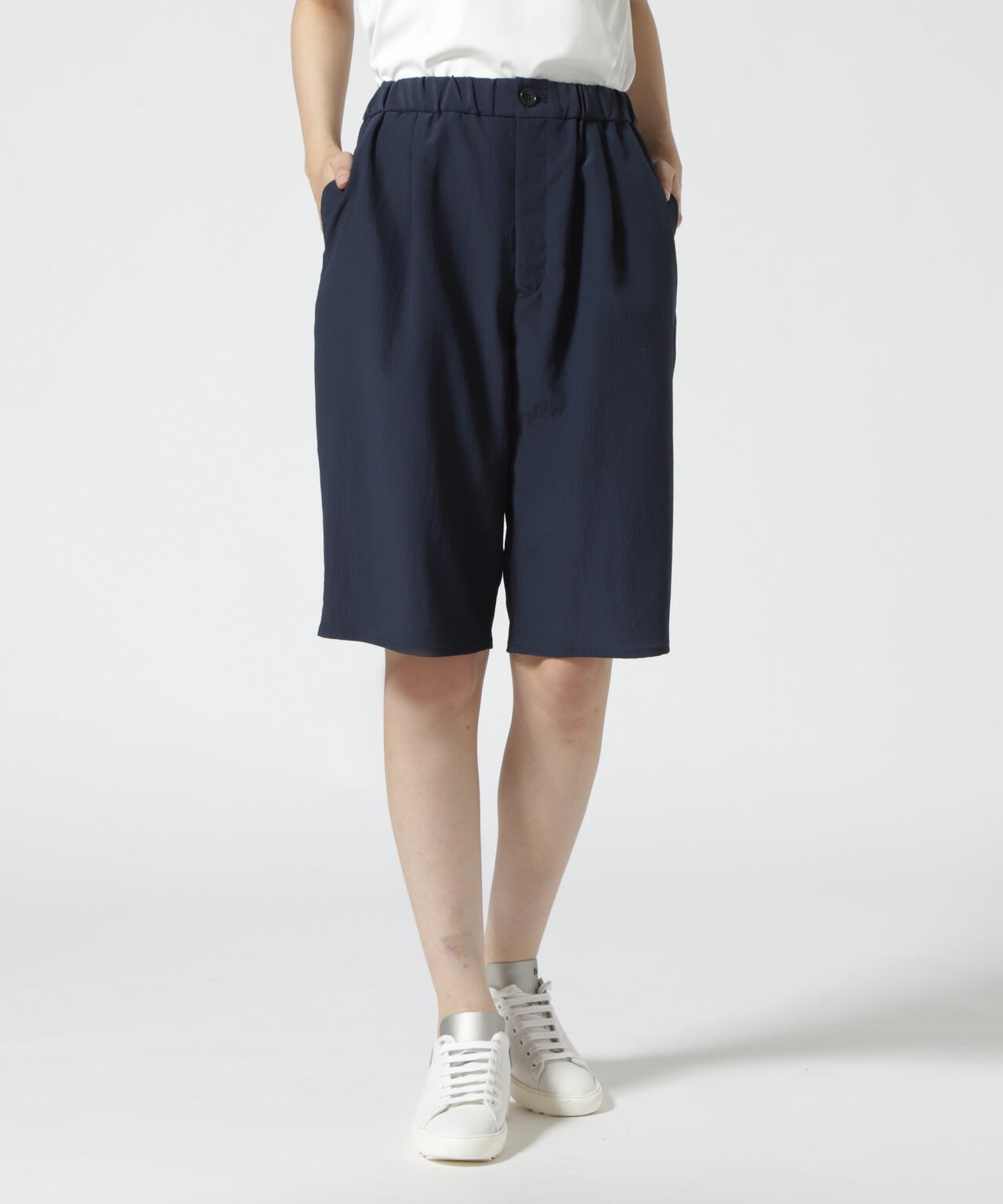 てろっとした生地感がポイントのショーツ。ウォッシャブル加工で洗えるのも嬉しいポイント。同じ素材のシャツジャケット(品番:785-2255800)とセットアップで合わせるのがオススメです。
