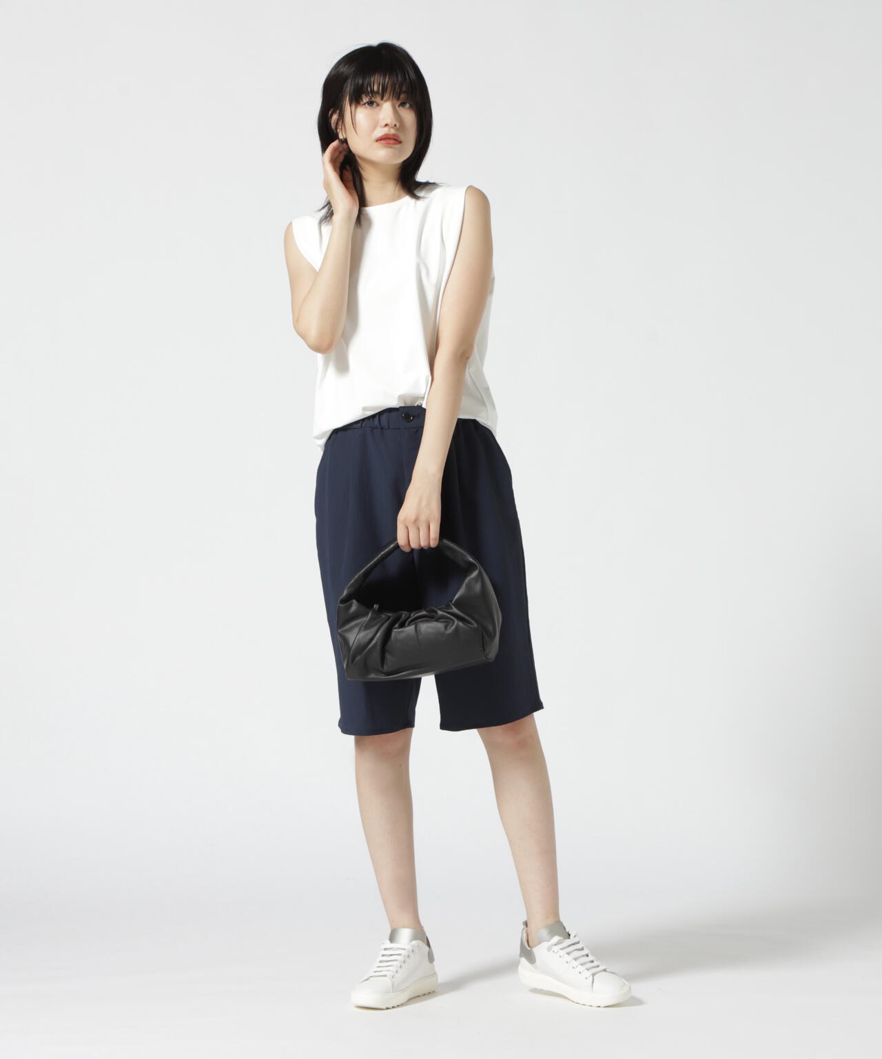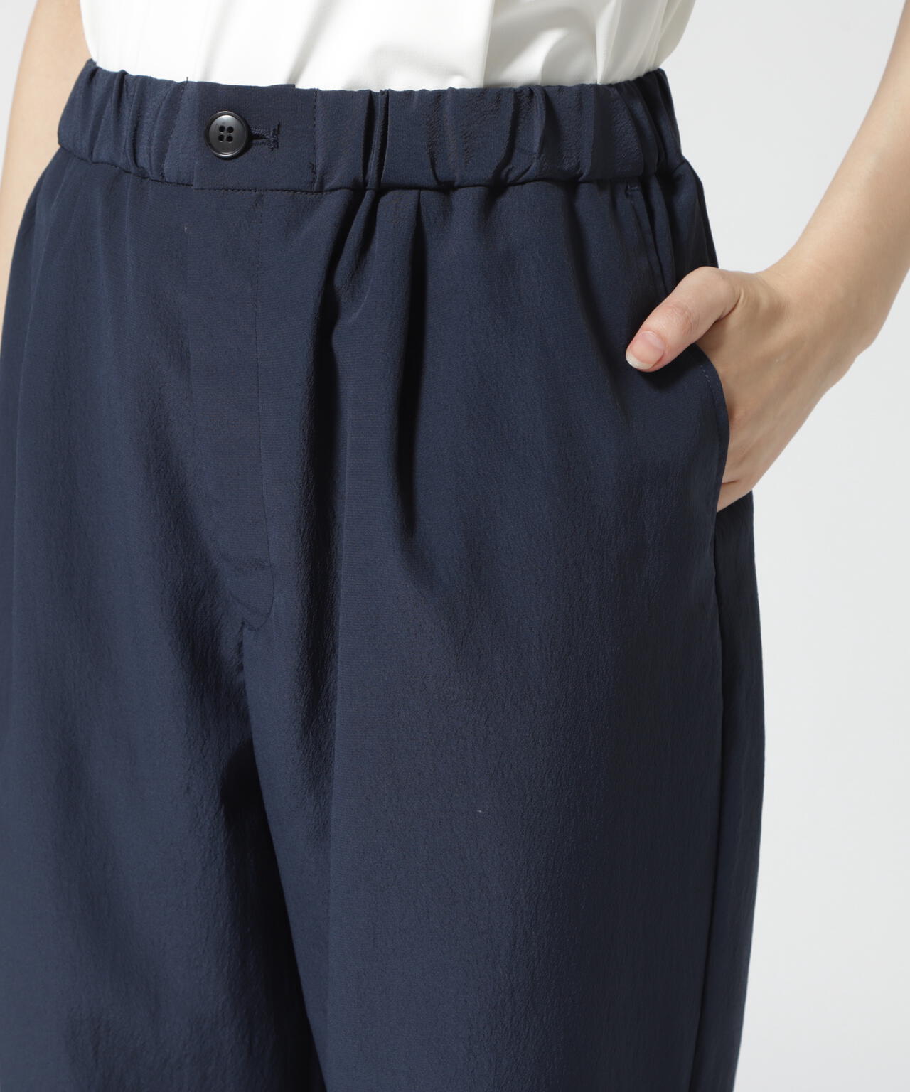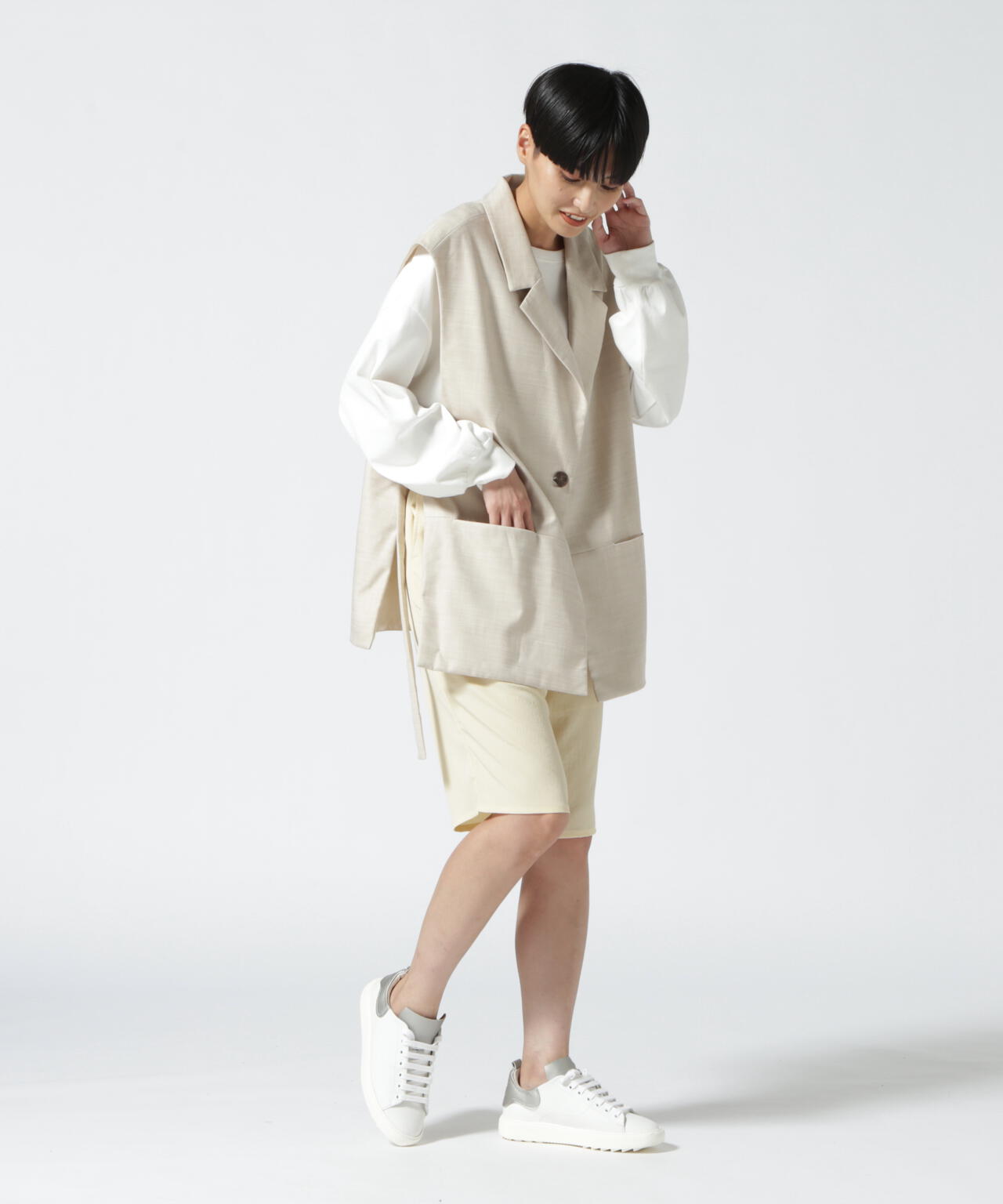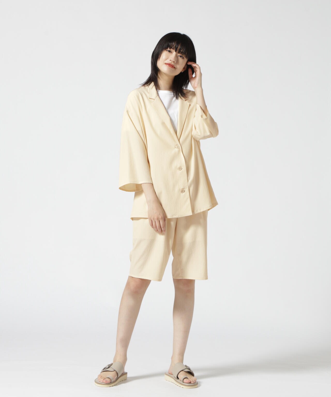 てろっとした生地感がポイントのショーツ。ウォッシャブル加工で洗えるのも嬉しいポイント。同じ素材のシャツジャケット(品番:785-2255800)とセットアップで合わせるのがオススメです。
