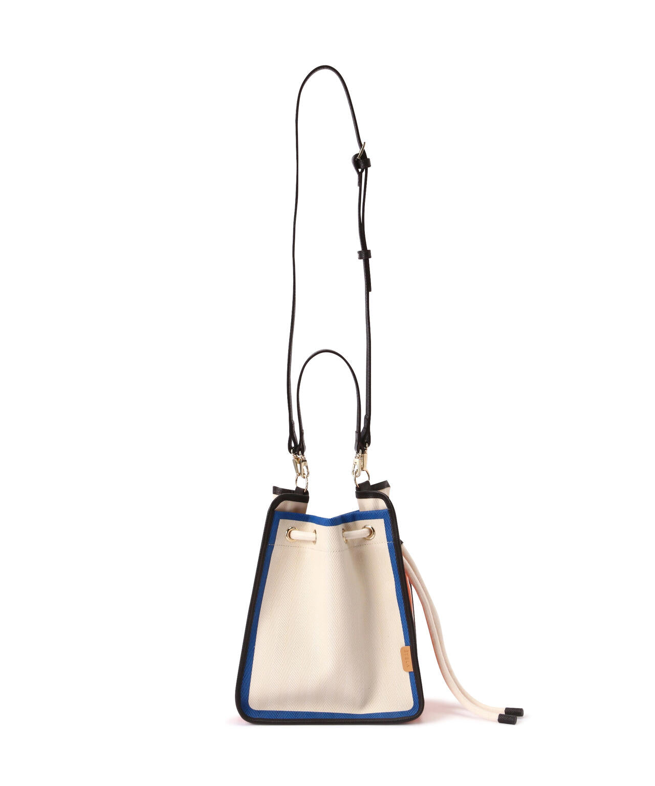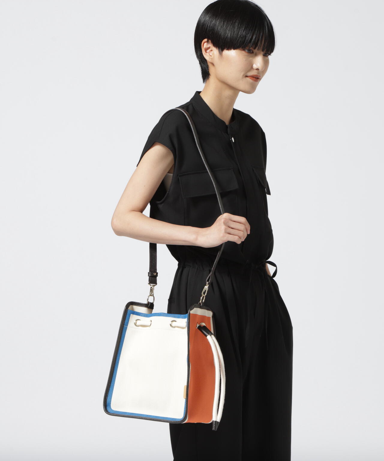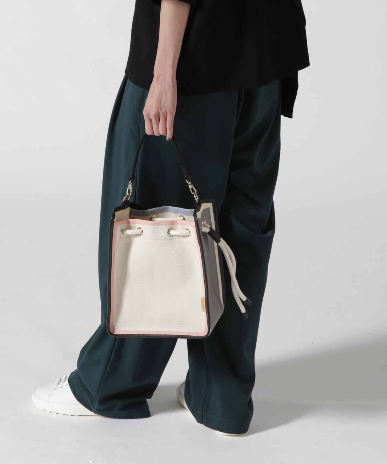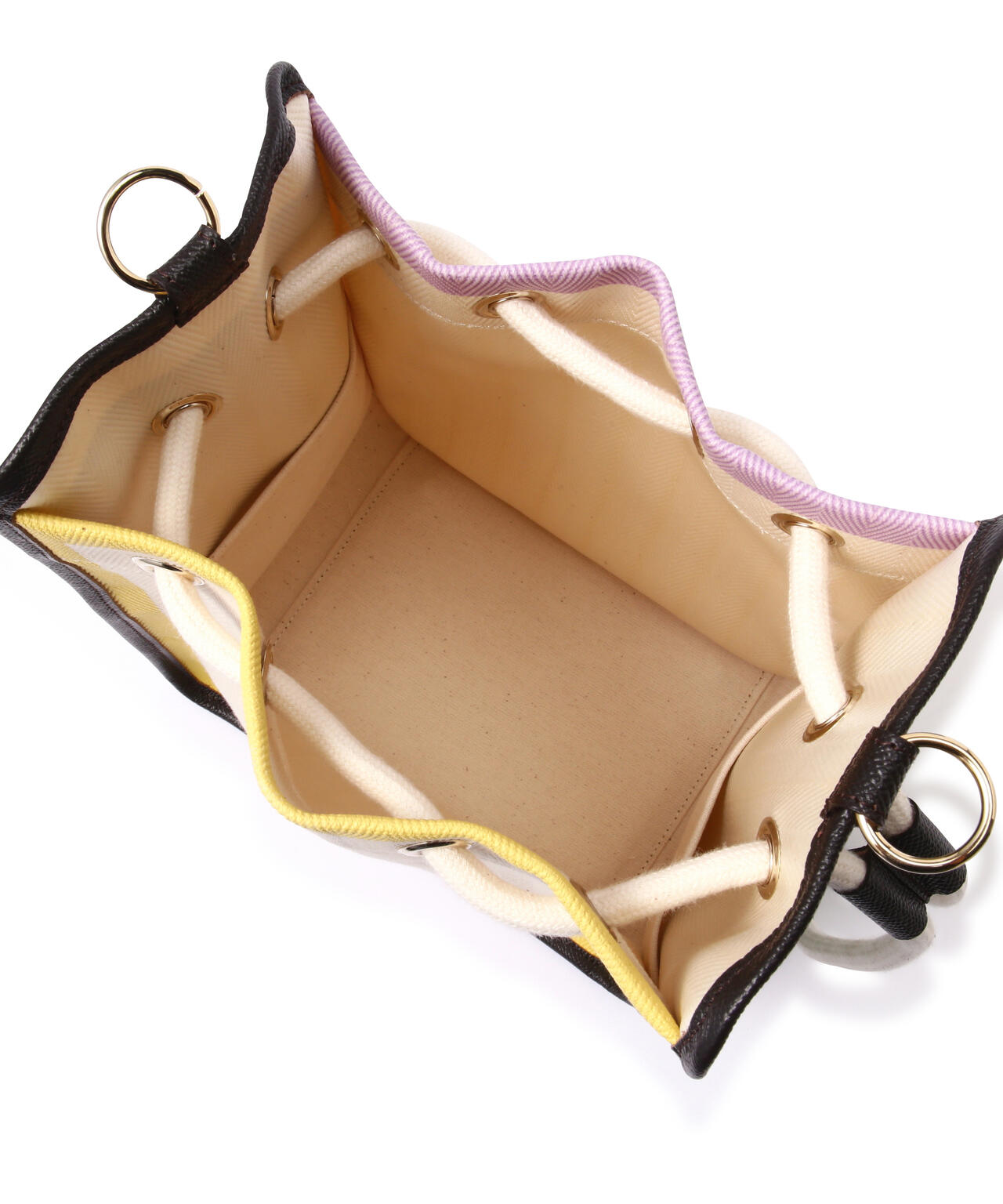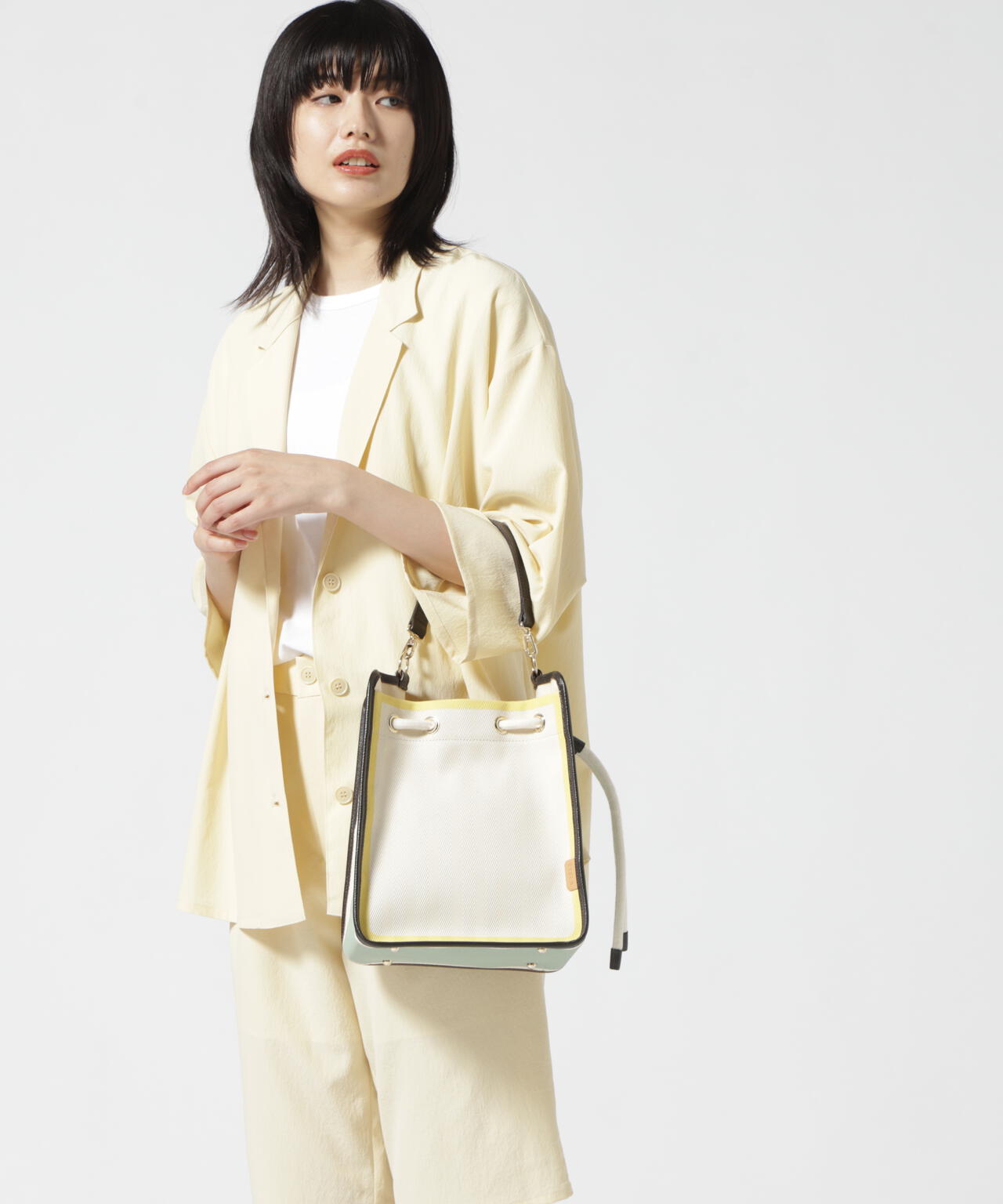 スクエア型でプリントが映える特徴的なフォルム。 ストリングを絞る事で表情の違いを楽しめます。手持ちとショルダー別々に取り外し可能なストラップが便利です。 非常に軽いキャンバスを使用することで、持ち歩きのストレスを軽減してくれます。 キャンバス内側にはコーティングを施しているため汚れにくく普段使いしやすい配慮も。 レザーのパイピングとハンドルがアクセントになり、日常使いのキャンバスを格上げしています。両サイドにポケットを配し、携帯や財布等を収納できます。