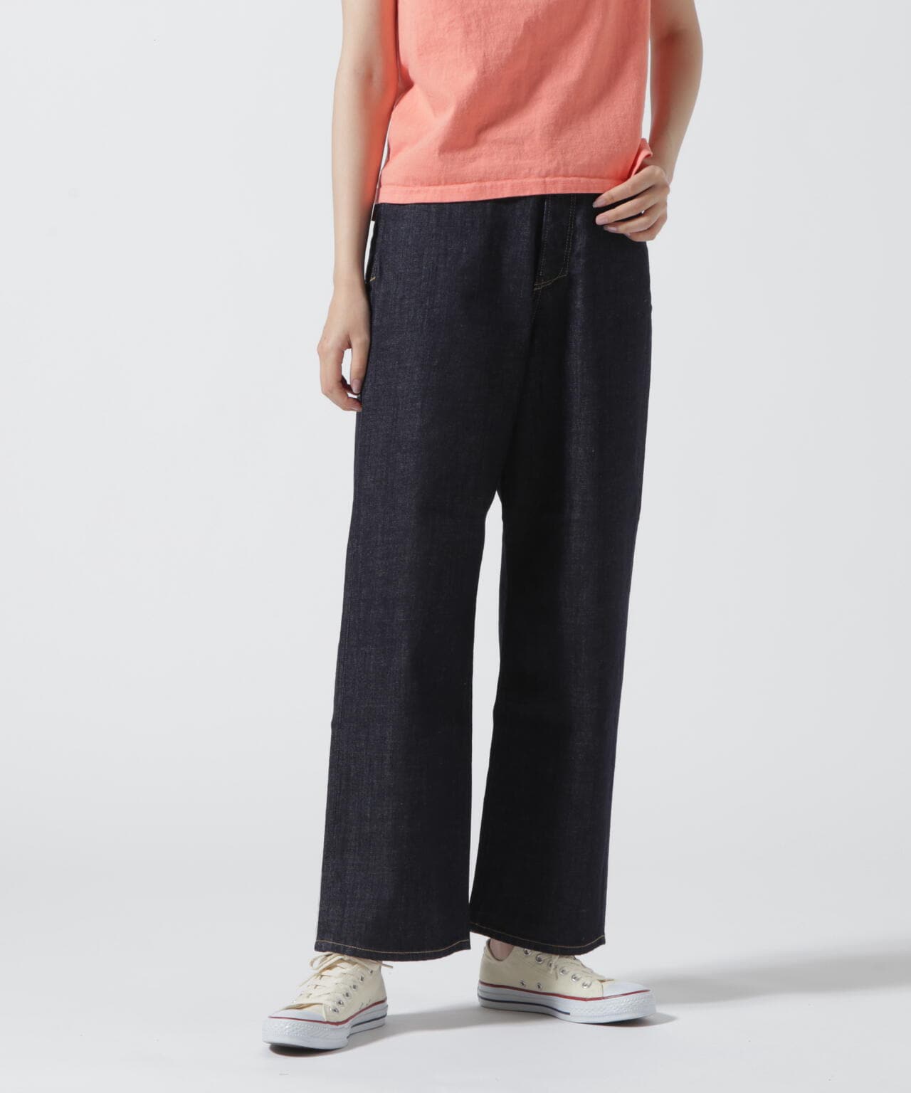 ボリュームのあるパンツですが、ウエストがキュッと入っていることにより、パンツのボリュームとウエストのギャップで華奢見え効果も生まれます。また、ボリュームが横に広がらず、ヒップの高さから下に落ちるので、後ろ姿の野暮ったさもありません。脚の形を気にせず穿ける太めストレートなので体型を選ばず着ていただけます。