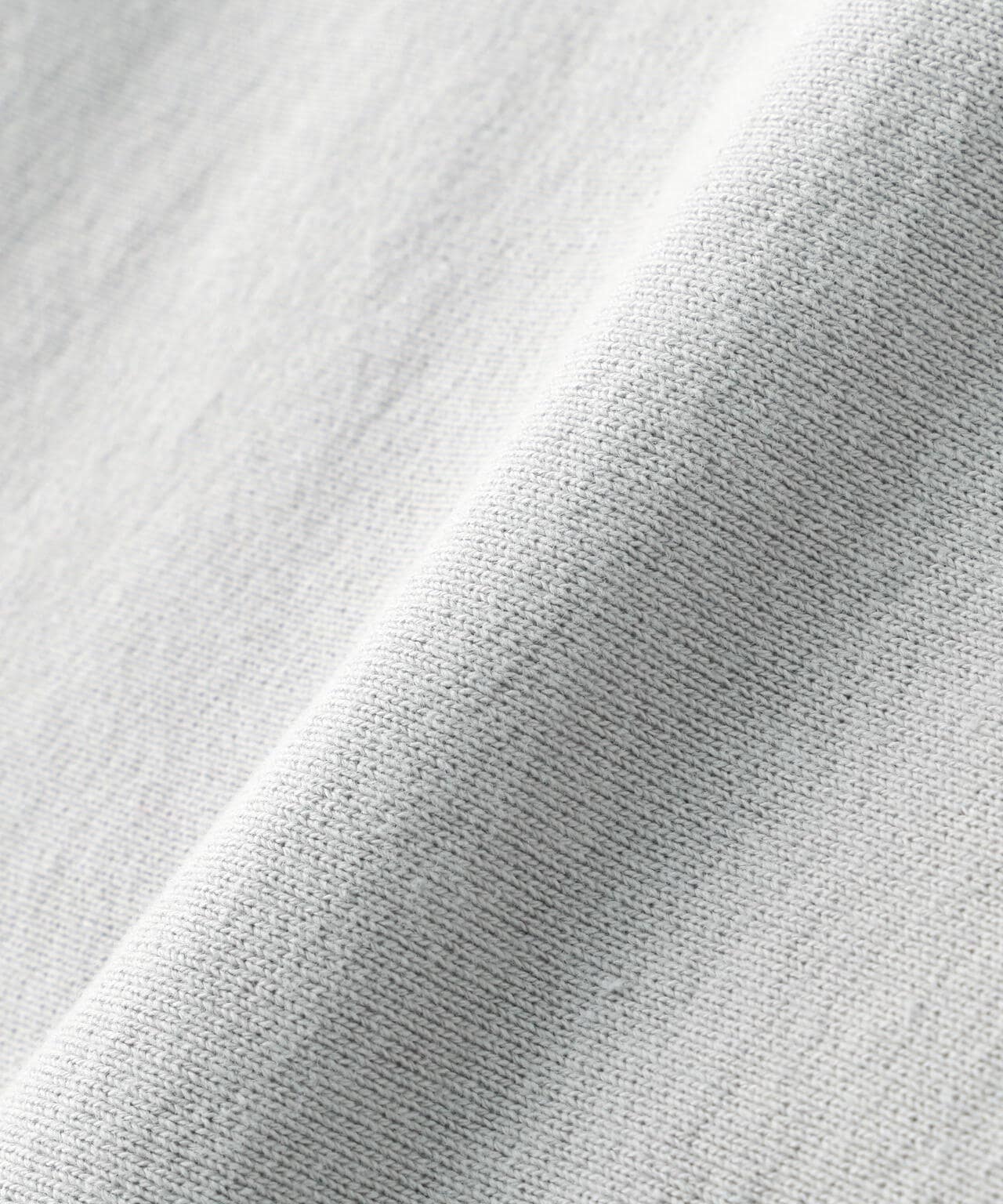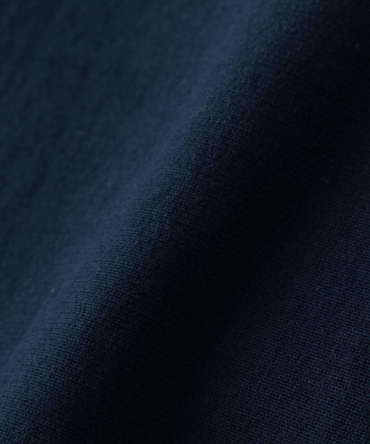 和歌山市で太番手の糸を通常の倍、限界まで高密度に編み上げたジャージー素材です。高密度に編み上げることで耐久性は勿論、製品染めをした後に、洗いをかけている為、縮みも起きません。裏毛は表面と裏面、その間を繋ぐ面の3層構造。間に空気を含む為、暖かさも兼ね備えています。