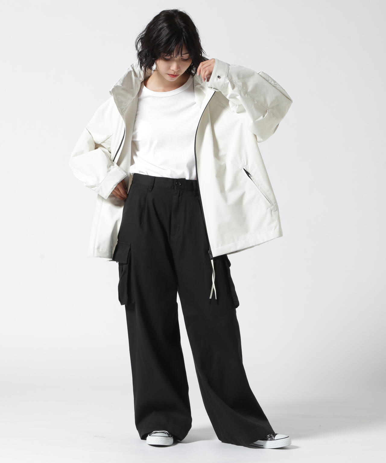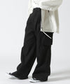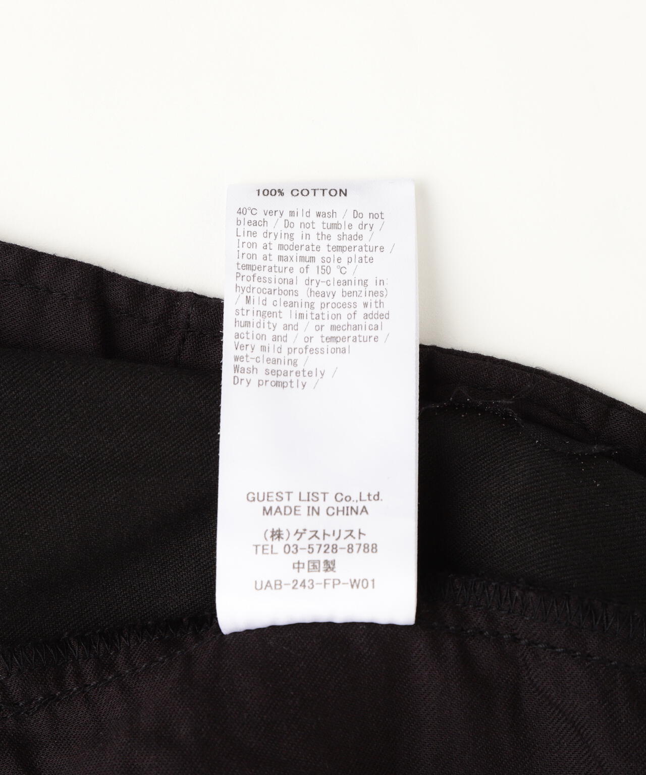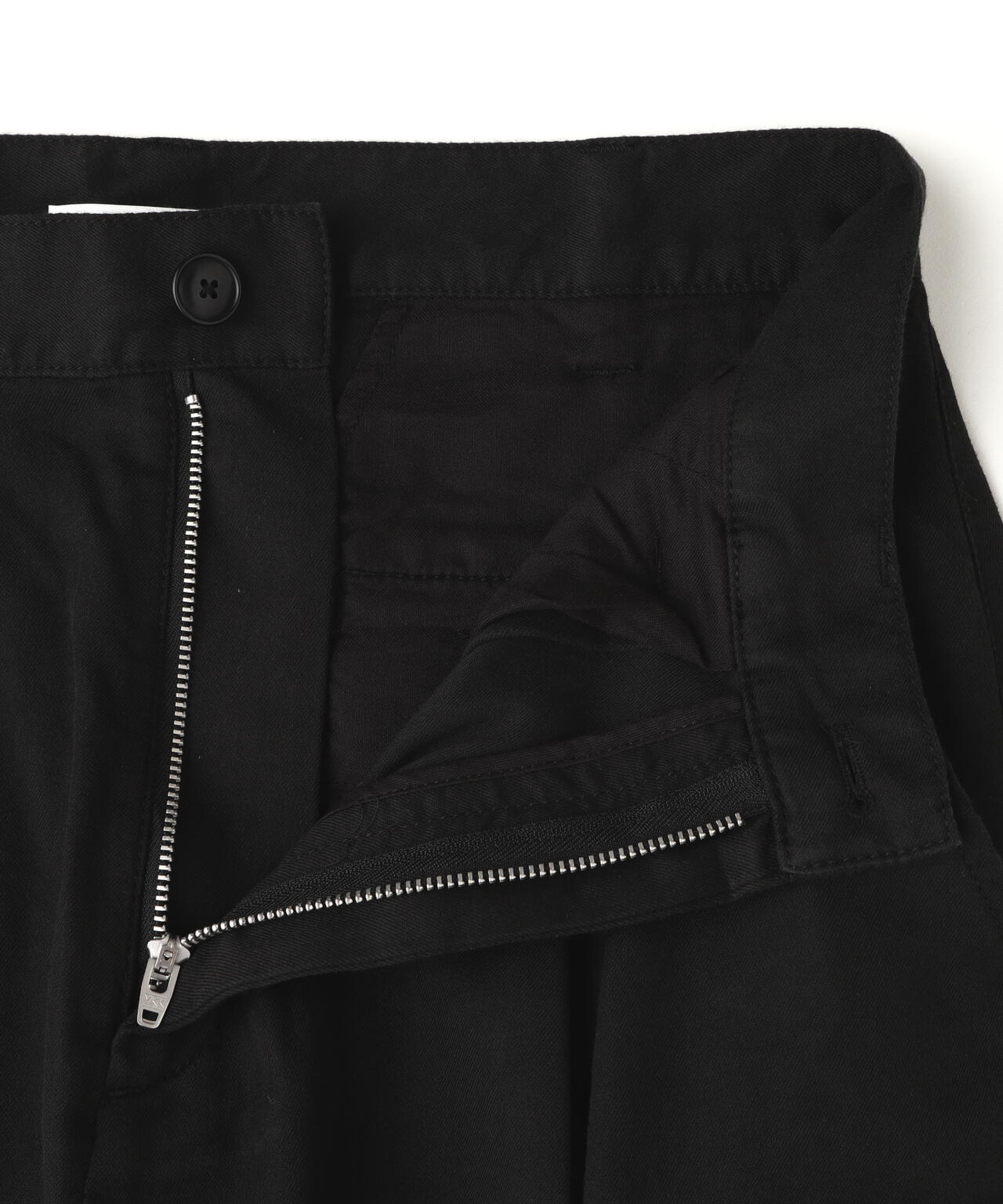 細番手の綿糸を二重織にした贅沢なチノ素材に後加工を施すことにより、テロっとした落ち感を表現。裾の杉綾テープを使用したドローストリングで柔らかなカーヴィーシルエットにもできる2WAY仕様。控え目なマチのタック入りポケット2つと両サイドポケット、バックの2フラップポケットで合計6つのポケットあり。
