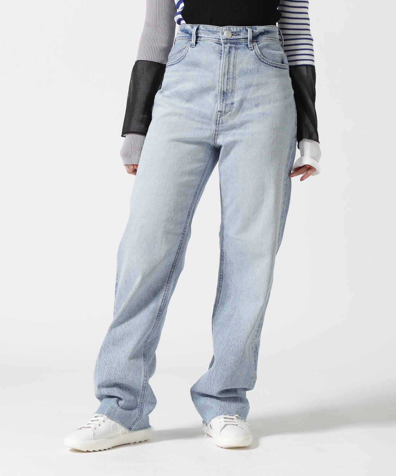 YANUKでも人気の淡色カラーは、明るいスカッとした淡色の中に、しっかりとスリを入れることでYANUKらしいメリハリのある表情に仕上がっています。ストレッチ入りの生地ですが、綿100%デニムのようなシボ感を再現し、愛着もって穿きこんだような古着風の表情に仕上げています。裾はカットオフになっており、抜け感のある足元を演出します。