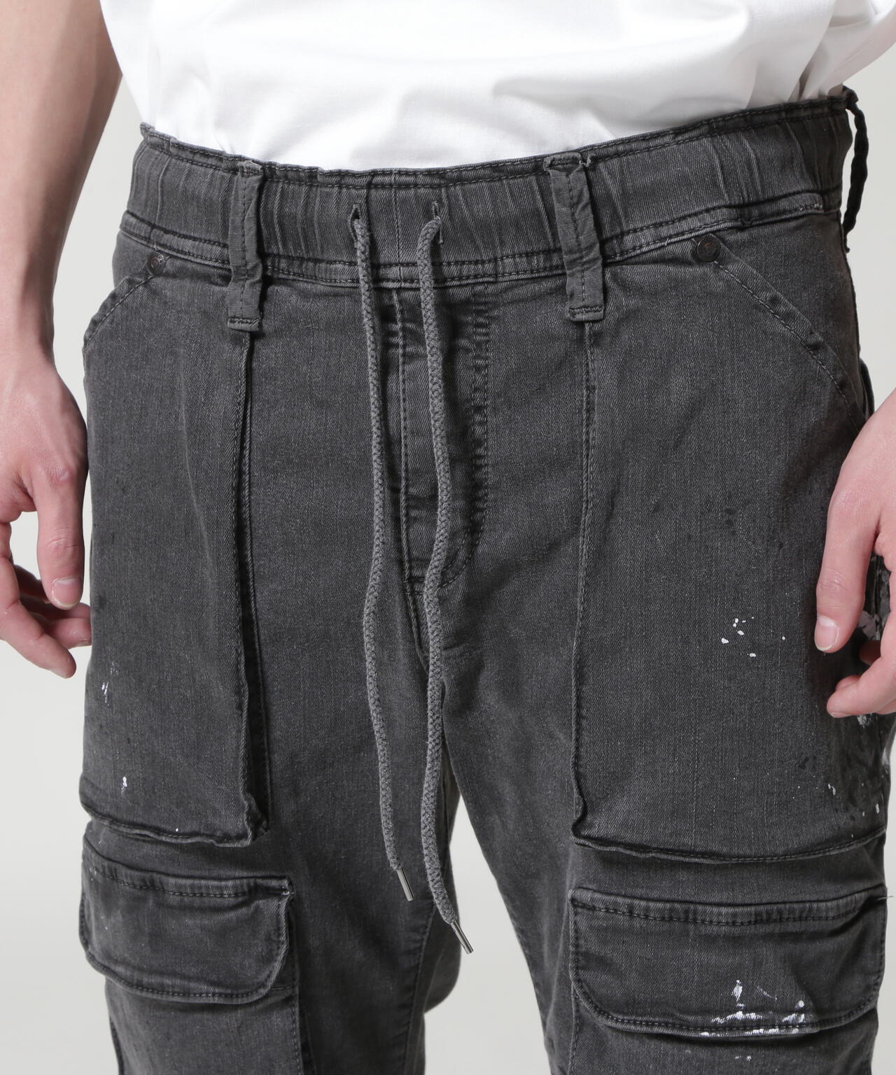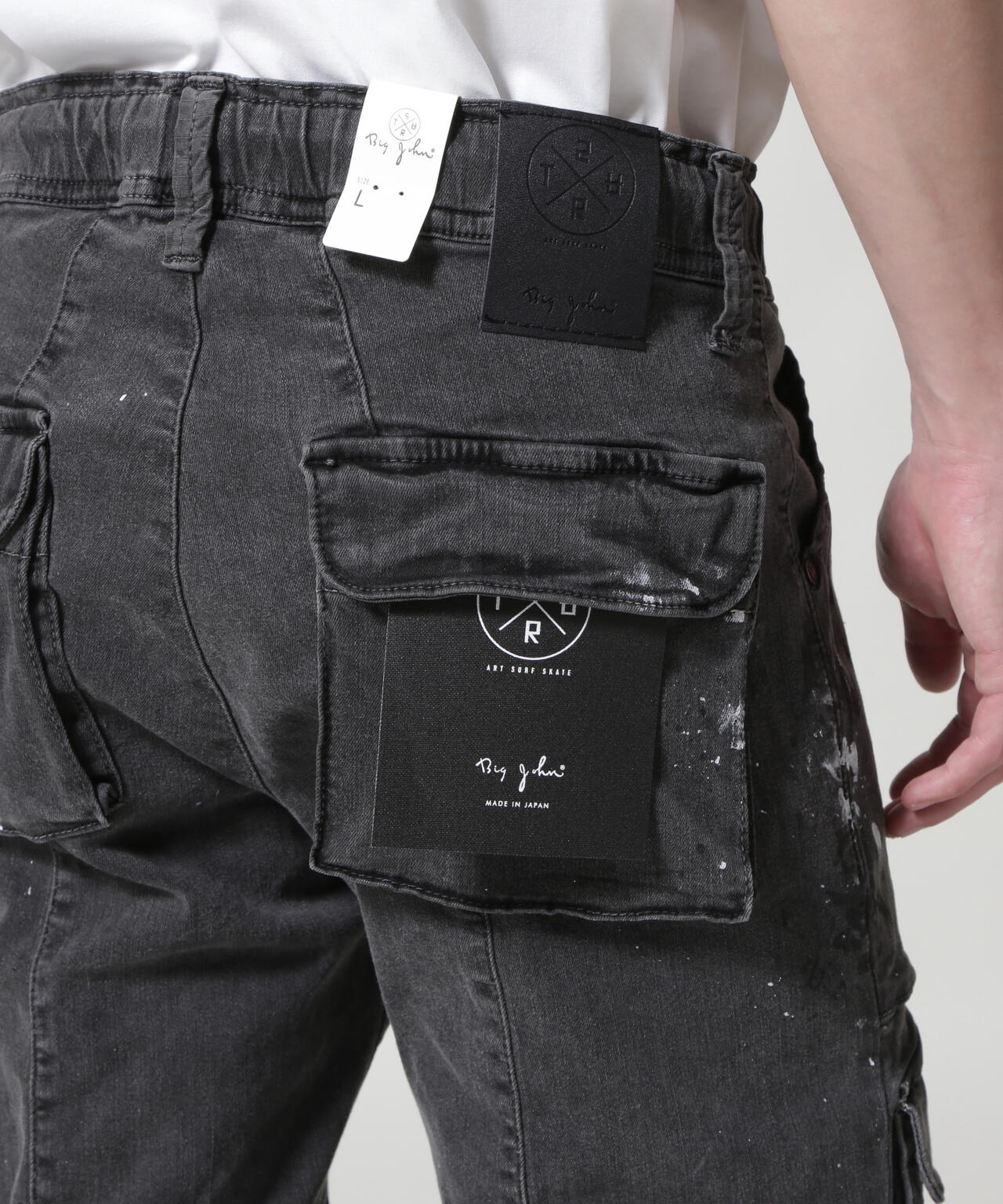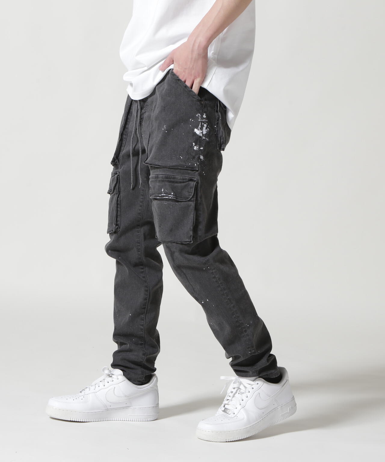 立体ポケットとハンドペイントが特徴なスーパーストレッチ素材のカーゴパンツ。